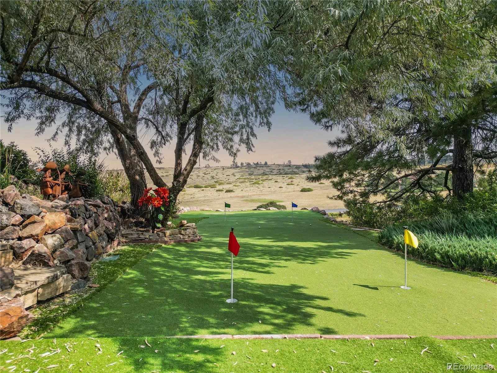Additional features include a 3-car garage, a Quarrix composite roof, two furnaces, an underground dog fence, an outdoor putting green, and horses permitted.