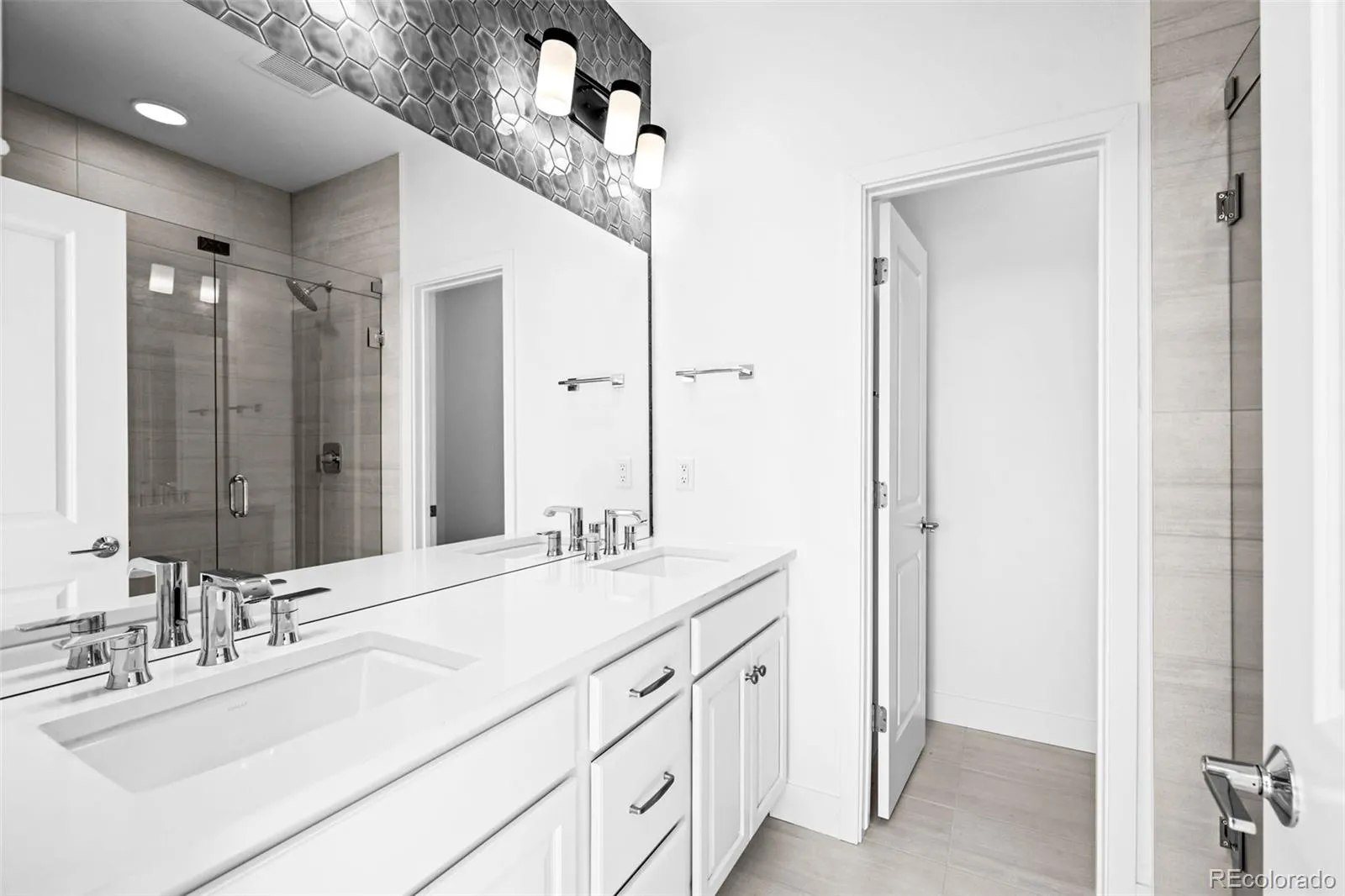 Upstairs, two generously sized bedrooms each offer luxury baths and walk-in closets. The primary suite showcases a frameless Euro shower and elevated designer finishes including ceiling-height tile, while the secondary bedroom includes a tub/shower combo with coordinating upgrades. A conveniently located upper-level laundry room with upper cabinets adds everyday ease.