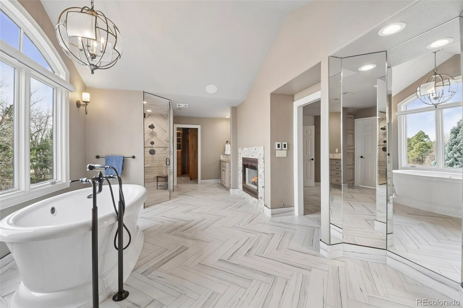 The primary suite is elevated in both placement and experience. Vaulted ceilings introduce volume, and the renovated bath is anchored by a freestanding tub overlooking the grounds, complemented by heated floors, a gas fireplace, and dual walk-in closets. The result is quiet scale and deliberate comfort.