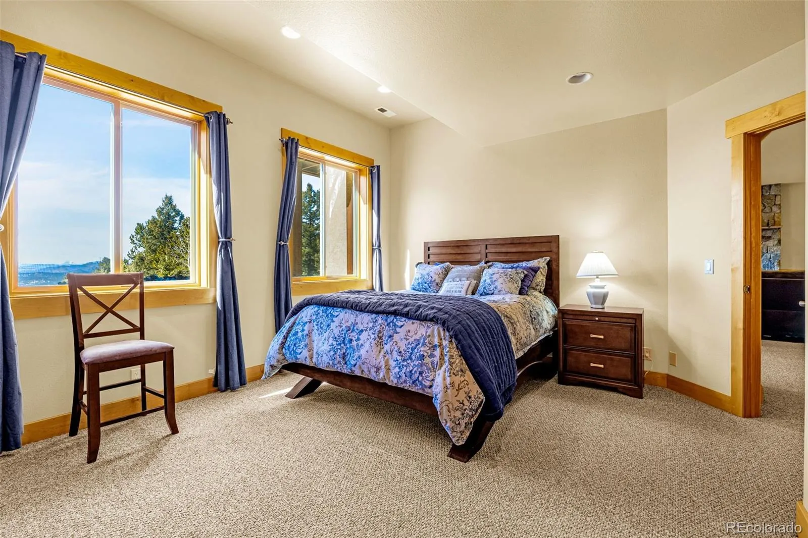 Experience refined mountain living in this stunning custom-built home, where craftsmanship and quality shine throughout. Perfectly positioned to capture sweeping views of the Sangre de Cristo Mountains, this property offers true main-level living on 3.08 acres. From the moment you step through the front door, your eyes are drawn straight through the open floor plan to the breathtaking views beyond the expansive composite deck. The main level features rich hardwood floors, a tongue-and-groove ceiling, and custom log railing details that blend elegance with mountain character. The open-concept living, kitchen, and dining areas are ideal for everyday comfort and entertaining alike. The living room showcases a dramatic floor-to-ceiling rock gas fireplace, while the kitchen is equipped with new stainless steel appliances including a cooktop and dual wall ovens, plus a generous walk-in pantry. The primary suite is a private retreat, complete with deck access, oversized picture windows that feature new electric shades, and a two-sided fireplace shared with the luxurious en-suite bath. Relax in the large soaking tub with the fire going or enjoy the expansive walk-in shower. A spacious walk-in closet completes the suite. A second bedroom is currently used as a home office with glass French doors and great closet space. Also on the main level: a powder room and an oversized laundry room with utility sink and abundant cabinetry for storage, which walks out to the 4 car attached garage. The walk-out lower level offers exceptional additional living space, including a large family room with a second gas fireplace and an oversized wet bar perfect for entertaining. Three additional bedrooms are located downstairs, two with attached bathrooms, and all featuring large or walk-in closets. A second laundry/storage room and an enormous utility room provide incredible functionality. This is Colorado mountain living at its finest—privacy, space and views that never get old.