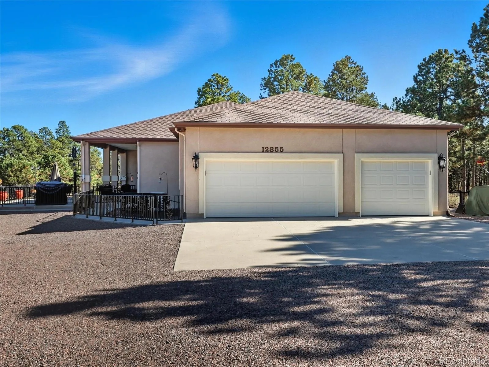 Welcome to this home in the North Ranch Park neighborhood, where homes rarely come available. Nestled only 1 mile from Meridian Rd on a private, treed corner lot spanning 5.5 acres, this nearly 5500 sqft home has 5 bedrooms, 5 bathrooms, a 3 car garage, and 2 offices. Perfect for multigenerational living, this home has 3 large primary type suites. Two are located on the main level, both featuring enormous walk-in closets. The third suite, located in the walkout basement, includes a private office with built-ins and a stunning bathroom with abundant built-in storage, including a bench below the window for extra storage. The main level has 9ft ceilings and elegant plantation shutters that add charm to the home. The kitchen showcases new quartz countertops, a stylish backsplash, and stainless steel appliances. The main level office includes an exterior door, ideal for welcoming guests privately. Enjoy gatherings on the impressive 400 sqft composite deck that connects to the living room and the primary suite. The finished walkout basement features a wet bar, a large living area, and access to serene outdoor spaces. Other features include 900 sqft of storage space with metal cabinets and shelving, two furnaces, and air conditioning for the top floor only to ensure balanced comfort throughout the seasons. The property also features a shed, a newer concrete patio areas, including a massive front patio surrounded by a custom fence. Enjoy the Colorado lifestyle with the pergola overlooking your private acreage where hummingbirds and deer are frequent visitors. The garden beds have a drip system as well. A whole-house generator powered by propane automatically activates when needed, and the well pump, replaced in 2022, produces a strong 8 gpm. With an ISO 3 fire rating, a 4 year old roof and only an 8 minute drive to Falcon, this home combines peace of mind with proximity to daily conveniences. Experience the perfect blend of serenity and privacy in this extraordinary home.