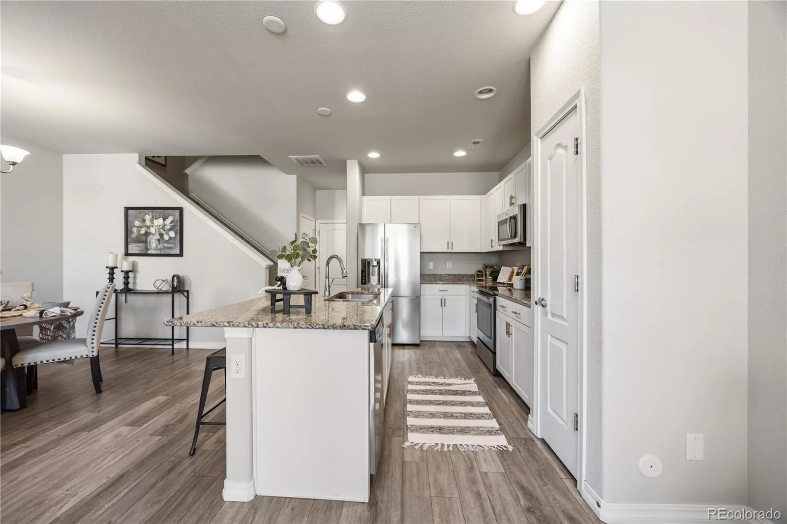 Two-story townhome nestled in a quiet neighborhood in the desirable Gold Hill Mesa neighborhood, boasting breathtaking Pikes Peak and Garden of the Gods views. Featuring an open main level layout, providing ample space for comfortable living and entertaining, a stylish kitchen with solid surface countertops, seamlessly flowing into the living area. The first floor is adorned with luxurious, durable laminate flooring, adding a touch of modern elegance to the open space. Ascending the stairs, you will find comfortable carpeting, adding warmth and comfort to the bedrooms. Off the main level, you will find a spacious 2-car garage. The Gold Hill Mesa community features green areas, a fitness center, a community center, and more.