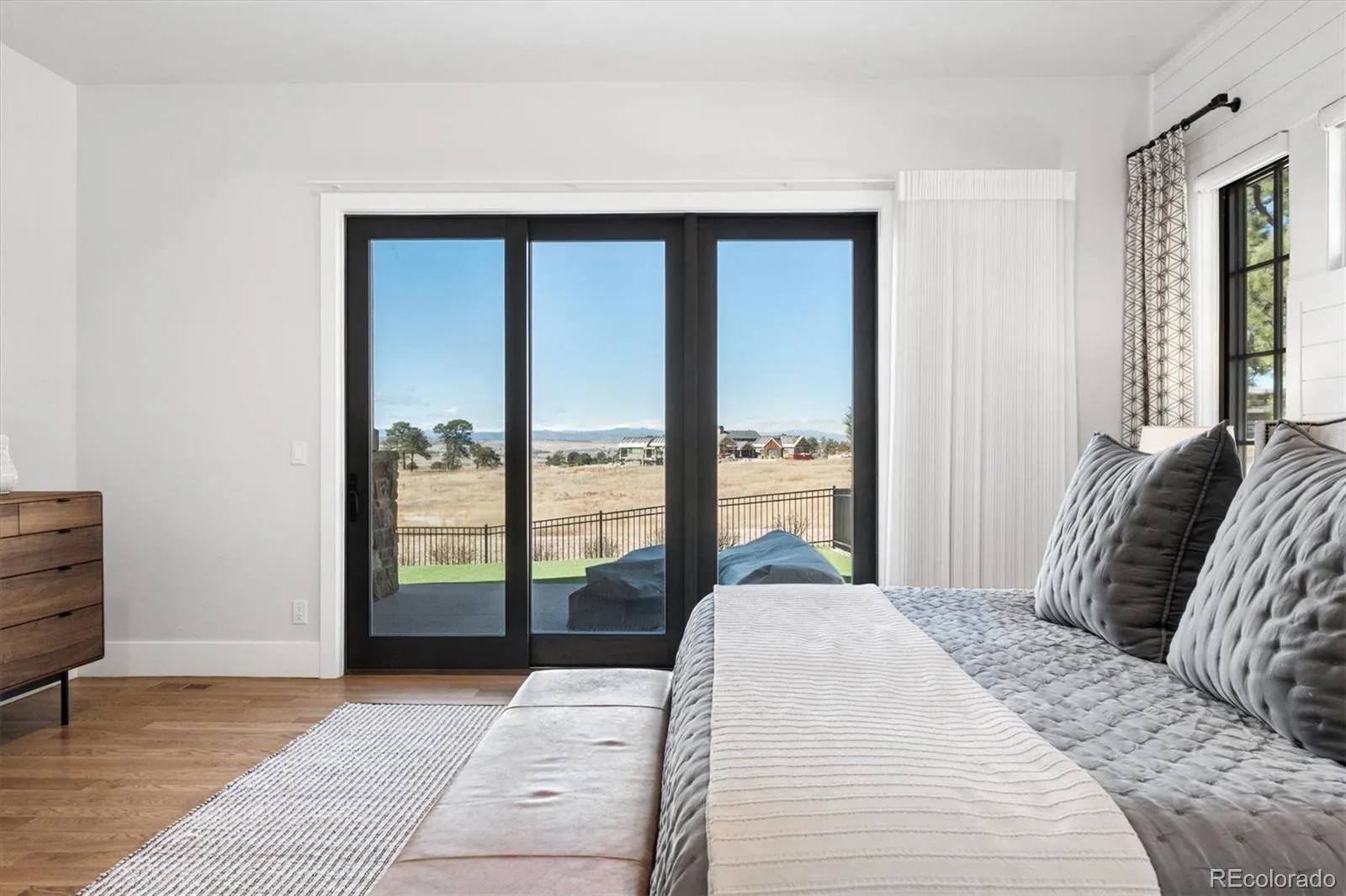 With 5 bedrooms, 7 bathrooms, and an attached 4-car garage, every detail reflects intentional design and elevated comfort. Sunlight pours through expansive windows, drawing your eye outward to breathtaking southwest-facing views of the Front Range, rolling prairie lands, and the home’s lushly landscaped grounds.