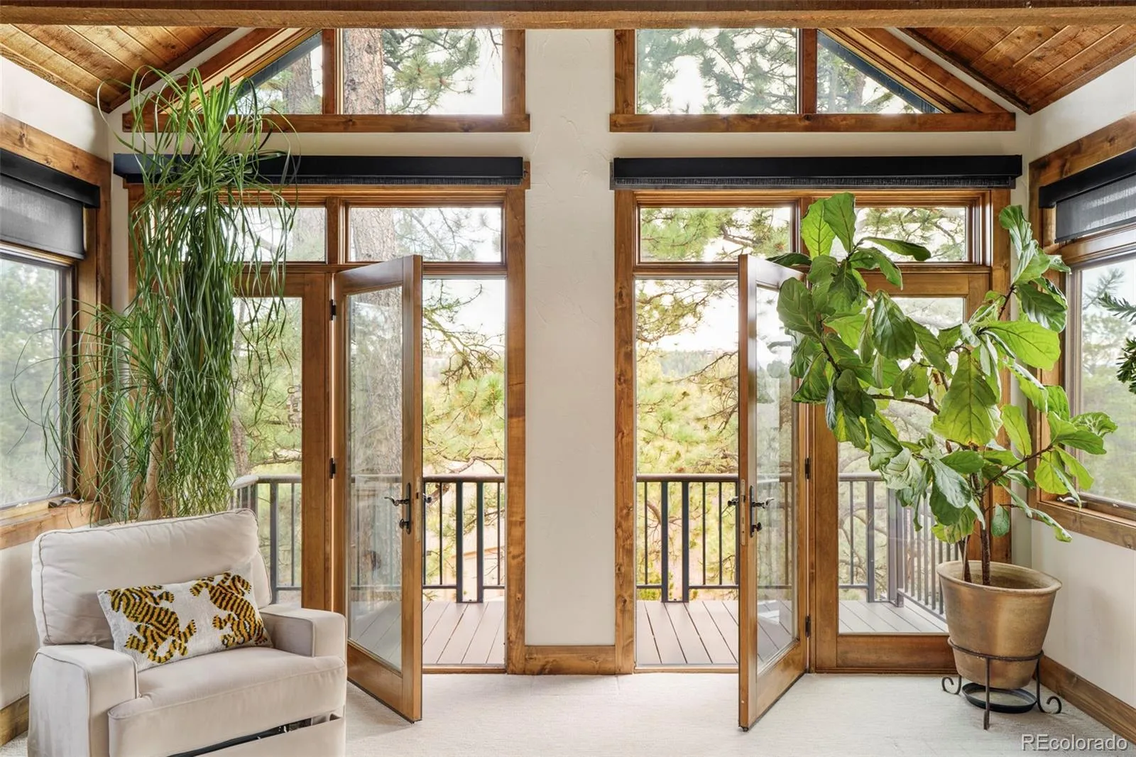 This serene and architecturally striking home rests on one of the premier lots in the Forest Park neighborhood of Castle Pines. With virtually no visible neighbors, the privacy and setting are truly exceptional. Walls of windows invite natural light to pour in, illuminating exquisite beams, rich woodwork, and refined copper finishes throughout. The open floor plan creates effortless flow from the living room to the dining area to an expansive office, blending indoor comfort with the beauty of the outdoors. The modern kitchen anchors the home with elegant quartz countertops and high-end Thermador appliances, designed for both everyday living and inspired entertaining. The primary suite is a retreat of its own. A glass-wrapped sitting room offers a treehouse-like experience suspended above the pines with mountain views. The spa-inspired bath features a freestanding soaking tub, an oversized two-person rainfall shower, and striking marble walls. Upstairs, two guest bedrooms feature spacious closets and private en-suite baths. The lower level invites gathering with a bedroom, ensuite bath, copper-faced bar, additional fireplace, and dedicated theater room. Four gas fireplaces throughout add warmth and intimacy. Outdoor living is extraordinary. A patio and deck overlook the tall pines and mountains backing to protected open space along the 18th hole of The Ridge at Castle Pines North, a Troon-managed public golf course. Enjoy sweeping golf-course, pine, and rock-cliff views without membership fees, initiation costs, or minimums. A built-in grill, heated pergola-covered seating area with a fire pit, and a grand cascading water feature flowing into a tranquil pond create a private sanctuary. Just moments from The Ridge clubhouse, offering dining and social events, this is a rare Forest Park offering where craftsmanship, luxury finishes, golf-course frontage, and Colorado wildlife converge.