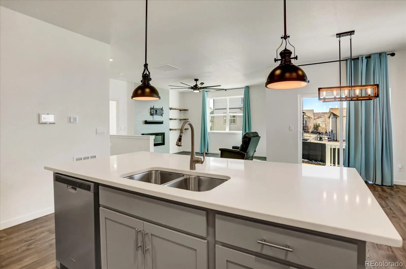 Welcome to this turn key home! The open main level unfolds with a bright white and modern gray kitchen, living room, dining area, and a main-floor primary suite designed for everyday ease. The kitchen shines with a huge eat-at quartz island, stainless appliances, and a generous pantry. Which flows seamlessly into the living room, where a sleek, linear SimpliFire remote-controlled LED electric fireplace anchors the space with modern warmth. The main-floor primary suite offers a peaceful retreat with an ensuite bathroom featuring dual sinks, a walk-in shower, and a large walk-in closet. Three additional bedrooms share a full bath, while the laundry room is conveniently located just off the two-car garage on the main level. Outdoors features a covered front porch and covered back patio. The low-maintenance backyard with rock, natural grass, and irrigation is a clean slate for your landscaping ideas. The massive unfinished basement is ready for the finish of your dreams. An oversized and drywalled 3 car garage makes parking easy. Community amenities include a pool and fitness center, nearby parks and trails, and convenient access around Castle Rock. Nearby to just about every imaginable shop and restaurant option and new additions include a planned Costco and a new I-25 interchange intended to enhance access and convenience to the neighborhood. Make this your next home today!