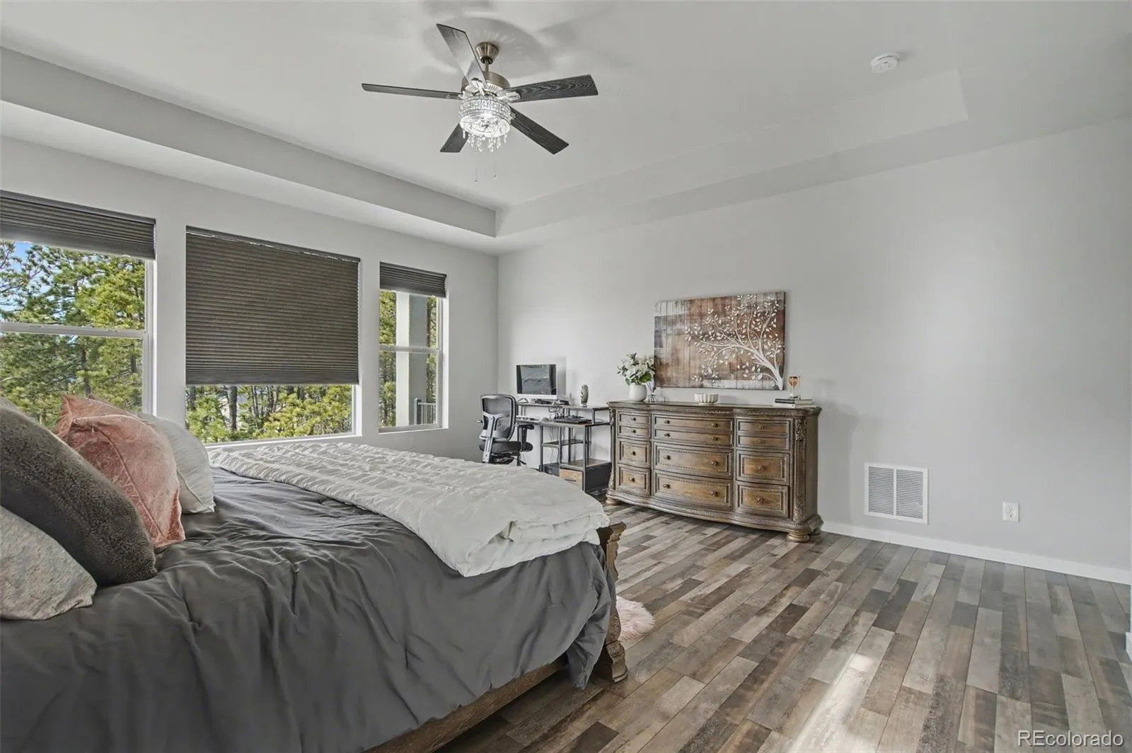 Perfectly positioned at the top of the highly sought-after Sanctuary Pointe, this exceptional Classic Grandview model sits on a larger, treed lot capturing breathtaking mountain views. Designed to impress even the most discerning buyer, this home seamlessly blends luxury, comfort, and thoughtful design. From the moment you step inside, you’ll appreciate the expansive open floor plan, soaring ceilings, and eight-foot main-level doors that create a grand, airy feel throughout. The heart of the home is the chef’s kitchen, featuring enormous island, black stainless KitchenAid appliances, large gas range with hood, combination microwave/oven, dishwasher, and oversized walk-in pantry—perfect for both entertaining and everyday living. Main level offers five-star functionality with a spacious laundry room (complete with automatic lighting and utility sink), a second bedroom, ¾ bath, and a luxurious Primary Suite. The Primary retreat features a spa-inspired bath and elegant barn doors for added style and privacy. Indoor-outdoor living shines with enormous glass sliders leading from the living room—complete with a sleek linear fireplace—to a covered deck plumbed for natural gas, overlooking tall pines and sweeping views. The fully finished walk-out basement is an entertainer’s dream, boasting a grand, oversized family room with wet bar, three additional bedrooms (including a private en suite), a half bath, and an additional ¾ bath with double sinks to serve the remaining bedrooms. The lower level opens to a patio and an additional seating area with firepit, creating multiple outdoor gathering spaces. Car enthusiasts and hobbyists will appreciate the impressive 682-square-foot garage with high ceilings, epoxy flooring, full drywall finish, and pre-wiring for electric vehicle charging. Additional premium features include central A/C, central vac, custom window coverings, soft-close cabinetry throughout, and high-end finishes at every turn. Colorado luxury living at its finest!