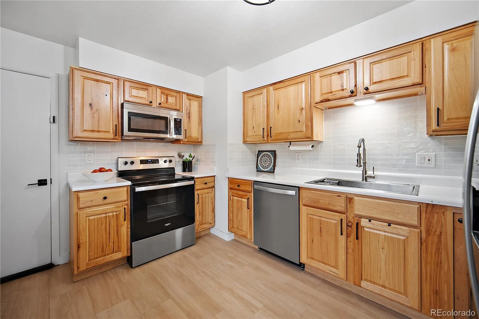 This beautiful home is located in the desirable Pleasant Valley neighborhood and boasts 4 beds, 3 baths, 1 car attached garage with additional covered parking in the backyard. The main level features new laminate flooring throughout as well as new paint. Entertain family and friends in the spacious living room that is open to the dining space that walks out to the back yard. The kitchen boasts SS appliances and new cabinetry. The primary suite is off the living room with a 3/4 ensuite bath. There are 2 additional bedrooms and a full bath on the main level. The fully finished basement with a huge family/rec room with endless possibilities along with a vintage bar perfect for entertaining. There is an additional bedroom and 3/4 bath with updated double vanity. The laundry room is located in the basement and also features room for extra storage. The fully fenced back yard with new fence, 2 car carport with access from the alley along with deck and patio space. Located on the Westside of Colorado Springs close to parks, schools and shopping. Minutes to Old Colorado City, Garden of the Gods as well as quick and easy access to I25.