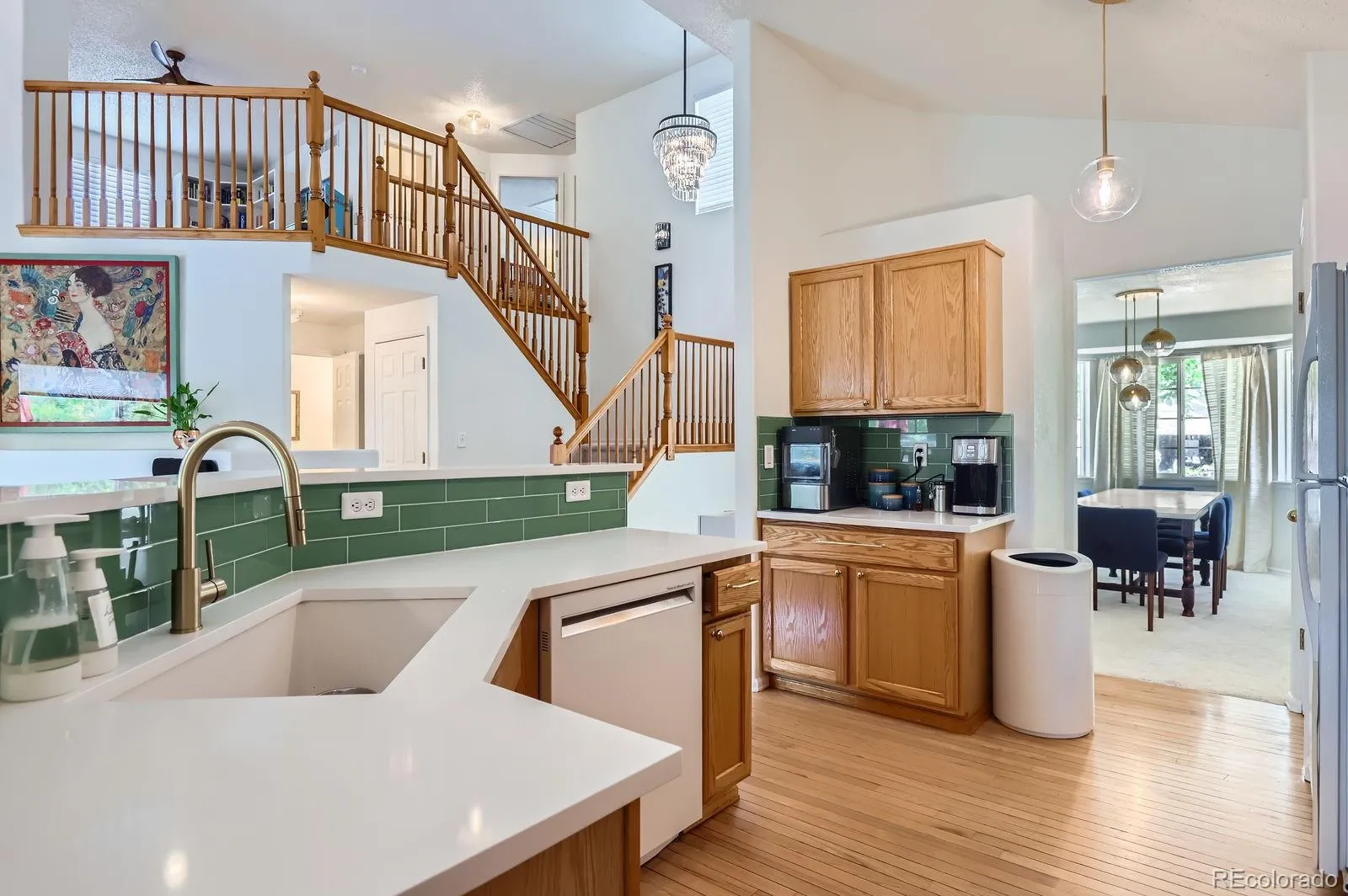 the formal dining room, or in the cheery kitchen with its white quartz countertops, green tiled backsplash, gas range and