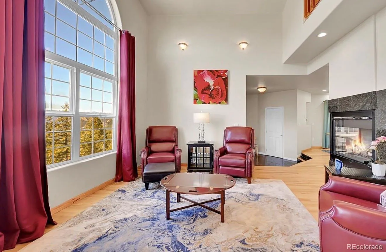 Step inside to a light-filled interior with vaulted ceilings, rich hickory floors, and expansive windows framing the views. The open-concept main level is designed for comfort and entertaining, featuring multiple living areas, French doors to the front decks, a two-sided gas fireplace, and a pellet stove for crisp Colorado evenings.