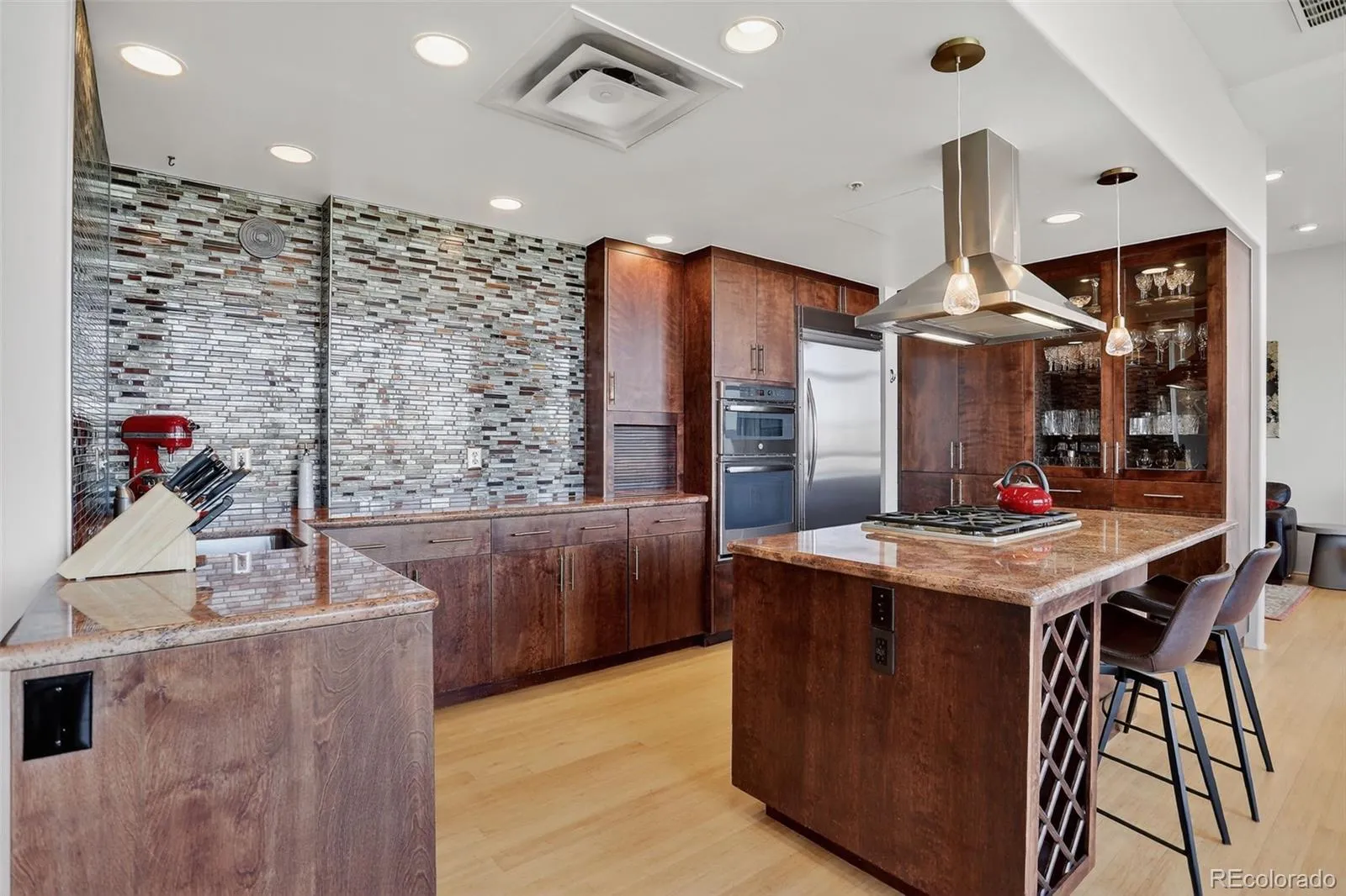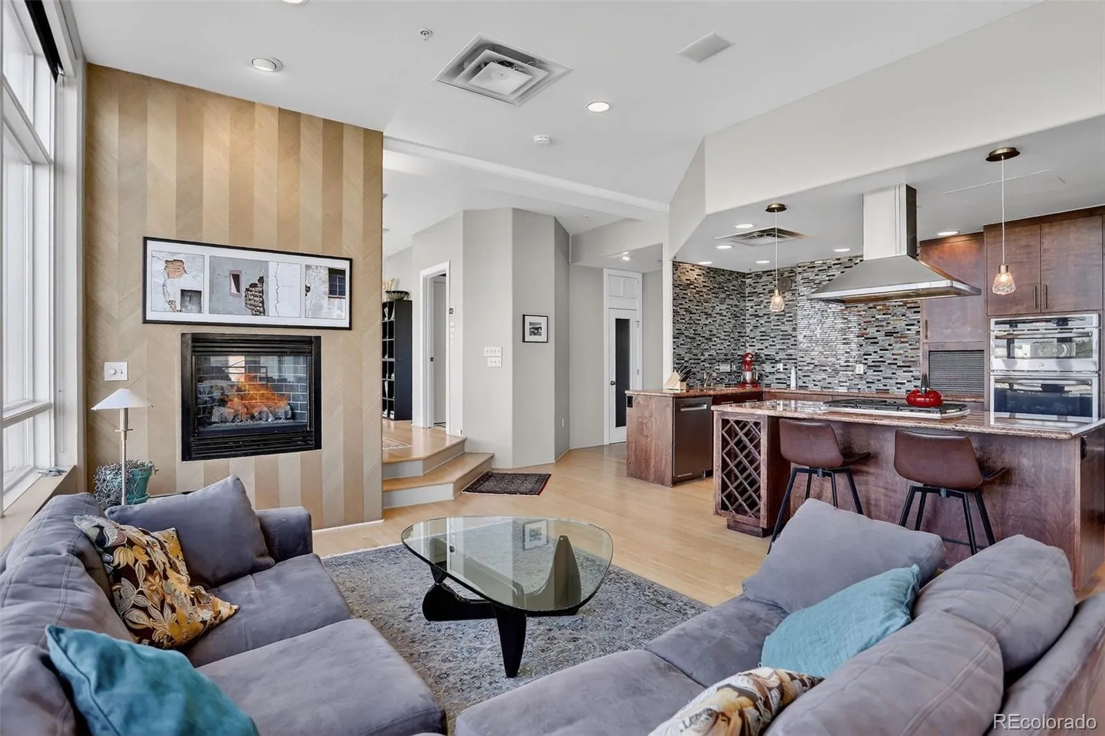 Inside, you’ll find a gourmet kitchen outfitted with high-end stainless steel appliances, custom cabinetry, granite counters, and a generous eat-in island—perfect for casual mornings or entertaining guests. The open-concept layout flows seamlessly into the expansive living area, complete with a gas fireplace and private balcony for enjoying Colorado’s epic sunsets.