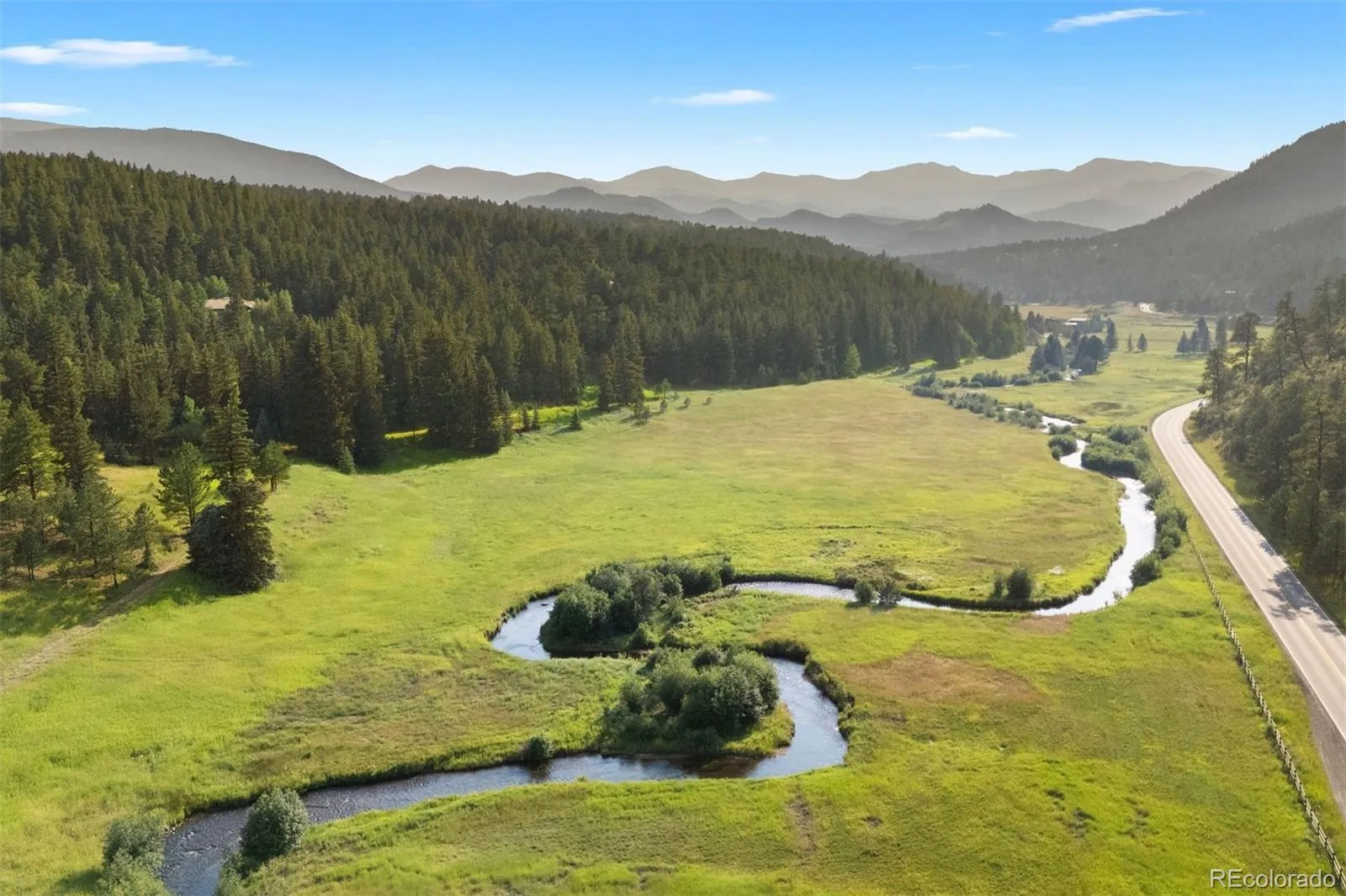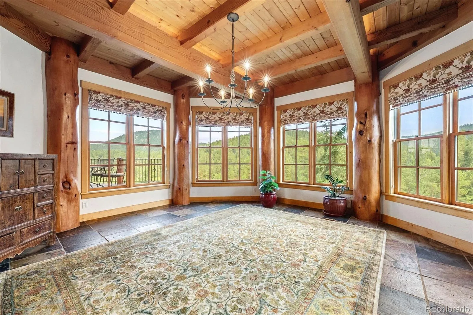 Within the prestigious Upper Bear Creek Ranch, this architectural masterpiece represents the pinnacle of custom timber frame construction. This extraordinary residence spans 6,354 square feet across thoughtfully designed living spaces, featuring four bedrooms and four bathrooms within a gated community where residents enjoy exclusive ownership of pristine land and private roadways. The home’s commanding presence begins with soaring vaulted ceilings and impeccable post-and-beam construction, creating an atmosphere of grandeur enhanced by expansive walls of windows that frame breathtaking mountain vistas. Rich cherry hardwood floors flow throughout, complemented by abundant built-in storage solutions and custom millwork that showcase exceptional craftsmanship. The gourmet kitchen serves as a culinary sanctuary, adorned with stunning stone accents that harmonize with the home’s natural aesthetic. Adjacent dining areas boast floor-to-ceiling windows and striking log posts that extend through multiple levels, creating seamless indoor-outdoor connections. The upper level houses three generously proportioned bedrooms, including a magnificent primary suite with panoramic views, luxurious en-suite facilities, and custom closet systems. Two additional bedrooms are accessed through an enchanting hallway featuring window seats and built-in bookcases, adding literary charm to the private quarters. The lower level transforms into an entertainment haven, complete with adobe fireplace, wet bar, wine refrigeration, and dedicated theatre space. An additional bedroom and bathroom provide flexible accommodations for guests or family members. This remarkable property offers exclusive access to riverfront areas, combining privacy with natural beauty in one of Colorado’s most coveted communities. The home’s proximity to Evergreen Lake, Alderfer/Three Sisters Park trails, and local golf courses ensures year-round recreational opportunities while maintaining mountain sanctuary tranquility.