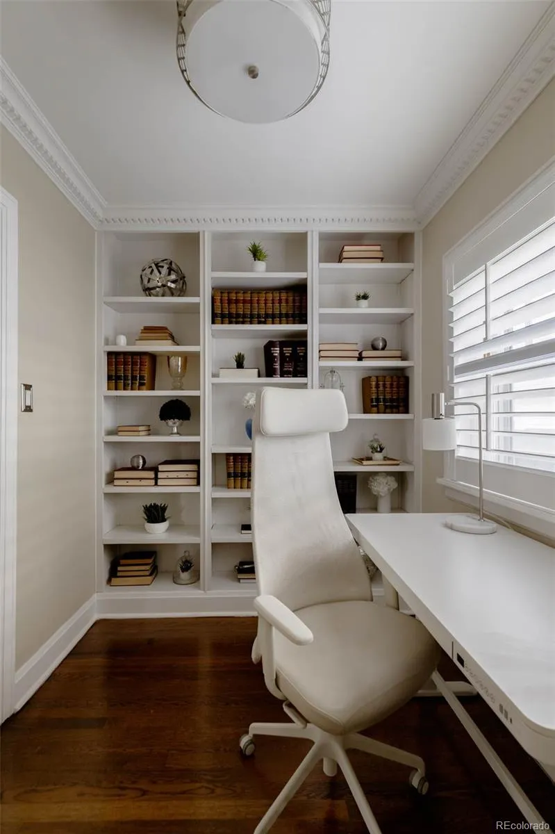 A neutral palette and intentional design choices highlight the home’s architectural character, including crown molding, arched openings, marble tile, picture-frame detailing, polished hardwood floors, and custom built-ins.