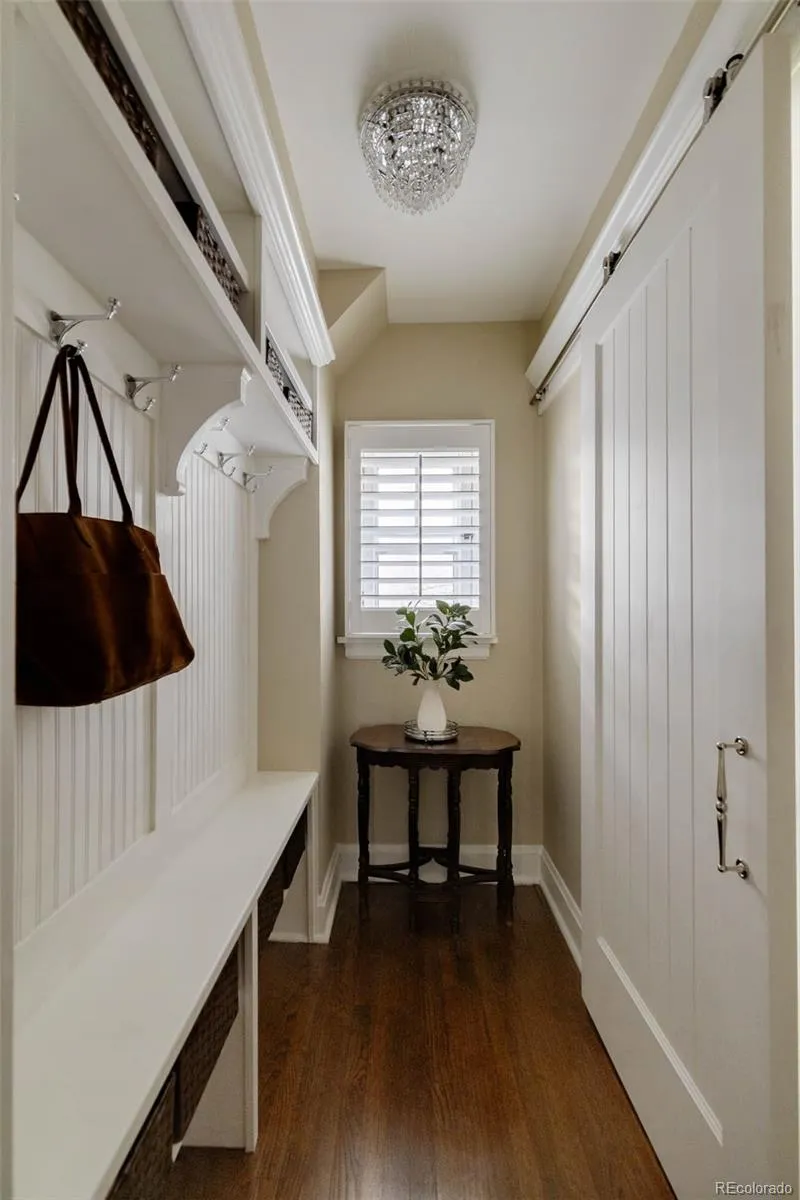 Upstairs, the primary suite includes a renovated bath with soaking tub, heated floors, and large-format continuous-vein porcelain tile on the walls and floors. The suite also offers a walk-in closet plus an additional closet for added storage. Three more bedrooms and a marble-tiled full bath complete the upper level, including an oversized bedroom currently used as a lounge and home gym. Original hallway cabinetry provides practical storage, and an upstairs laundry closet adds everyday convenience.