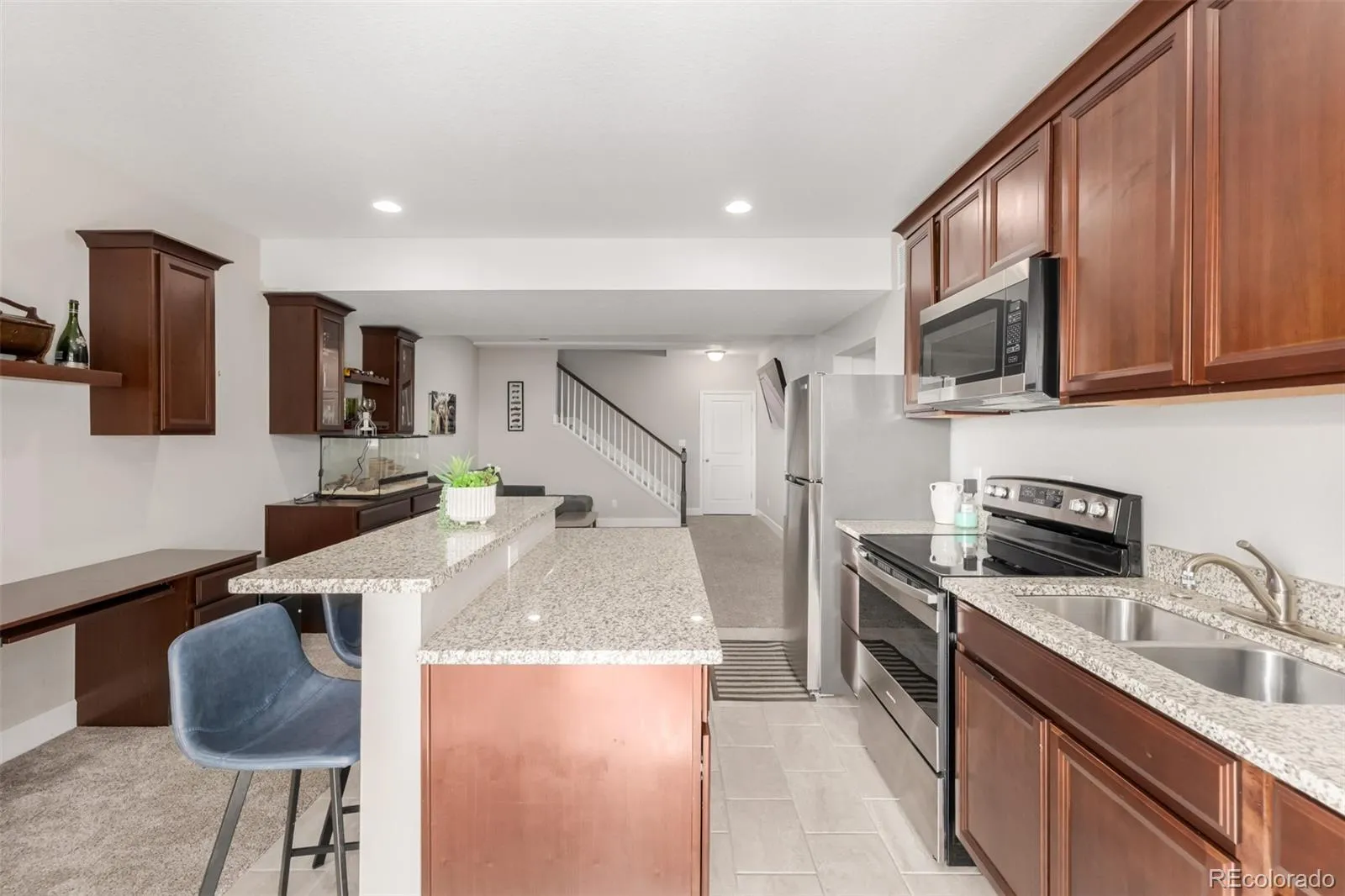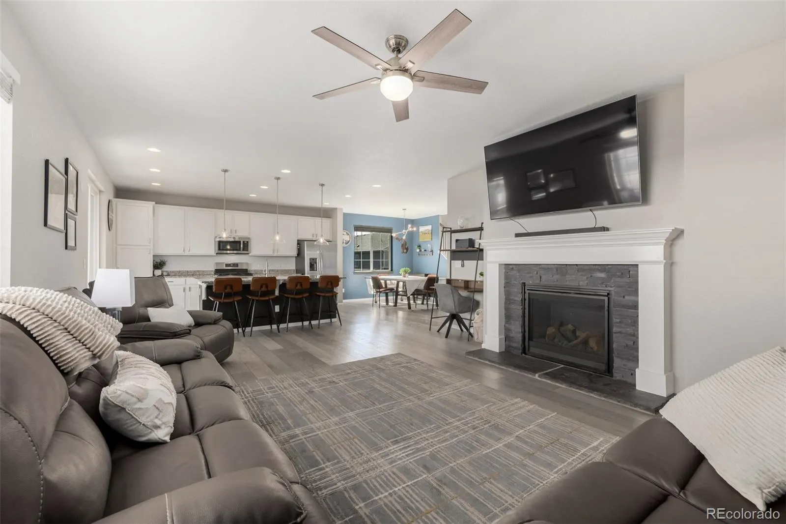 This welcoming residence carries a quiet confidence that feels both grounded and thoughtfully elevated. Set on a charming corner lot, gentle appeal draws the eye toward a covered front porch that invites slow moments watching the neighborhood move by. The home flows directly into the main living spaces, creating an immediate feeling of connection and warmth. The dining room sits comfortably alongside the kitchen and is filled with natural light. A sputnik style light fixture adds a note of personality + modern edge. The kitchen is timeless with white cabinetry, stainless appliances, elegant pendant lighting, undermount sink, and recessed lighting. The living area is spacious and bright, anchored by a iconic fireplace that naturally gathers the space. Upstairs, newly installed carpet brings a fresh comfortable feel to the private spaces. A dedicated laundry adds everyday convenience, while a flexible loft offers versatility. The primary suite is generous and light, with an inviting ensuite bath featuring spa-inspired finishes including an oversized shower, dual sinks, and a beautifully arranged walk-in closet. Two charming additional upper-level bedrooms are well proportioned. The fully finished walkout basement expands the home in a meaningful way. With a private entrance, full second kitchen, living area, bedroom + bath, and dedicated laundry, the lower level is ideal for multigenerational living or flexible rental potential. A beautifully enclosed sunroom sits just off the kitchen and opens directly to the backyard, creating indoor/outdoor connection. A covered back deck offers a shaded perch to enjoy Colorado sunshine throughout the seasons. The backyard itself is quiet and nicely landscaped, offering room to relax or entertain alike. With a 2-car attached garage and a layout designed to adapt to many chapters of life, this residence blends traditional warmth with modern livability in a way that feels both intentional and enduring.
