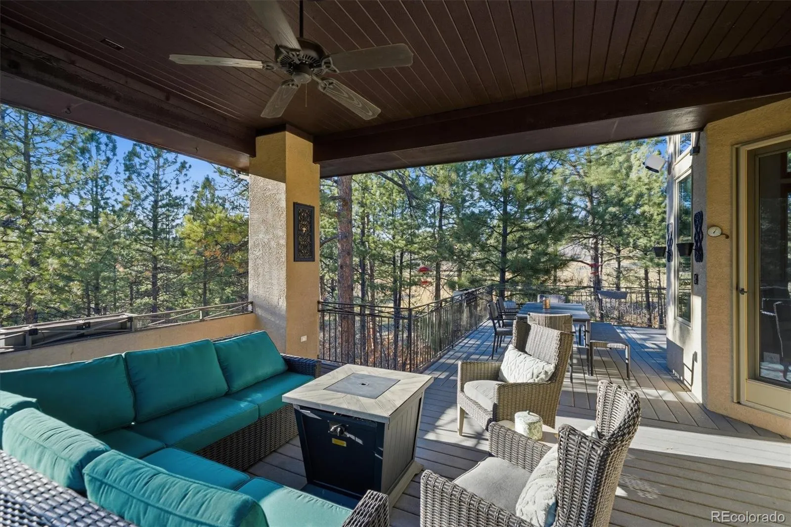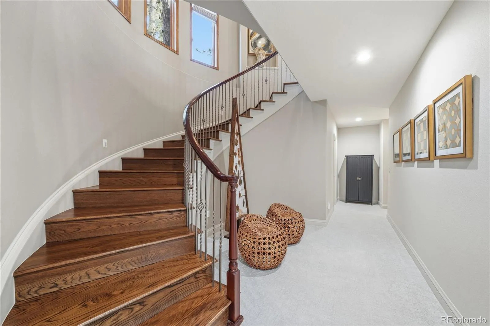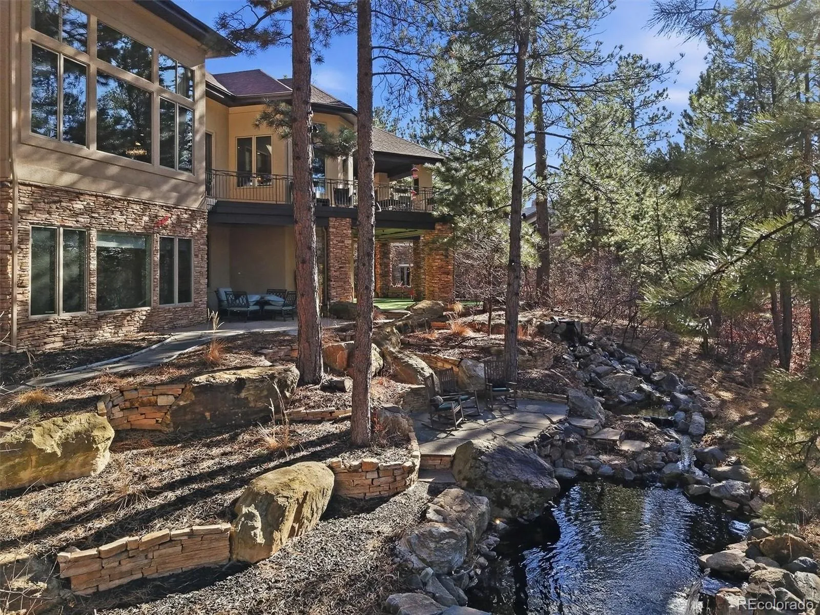 Experience luxury living on the ridge in this exquisite 5,800-square-foot walkout estate, perfectly positioned along the 18th hole of the prestigious Ridge Golf Course in Castle Pines. This masterpiece of design welcomes you with soaring 12-foot ceilings on the main level and an elegant oak curved staircase that sets a sophisticated tone. The gourmet kitchen is a chef’s dream, featuring alder cabinetry, quartz countertops, a Sub-Zero refrigerator, and a high-end Ristafallet Pro smart workstation sink, all supported by a walk-in pantry and a butler’s pantry with a dedicated wine cooler. The primary suite serves as a true sanctuary, offering a double-sided fireplace, a private retreat area, and a spa-like five-piece bath with a massive walk-in closet organizer. For those working from home, the dedicated den provides a quiet workspace with gorgeous cherry built-ins and crown molding, while the family room captures breathtaking golf course views through floor-to-ceiling windows.