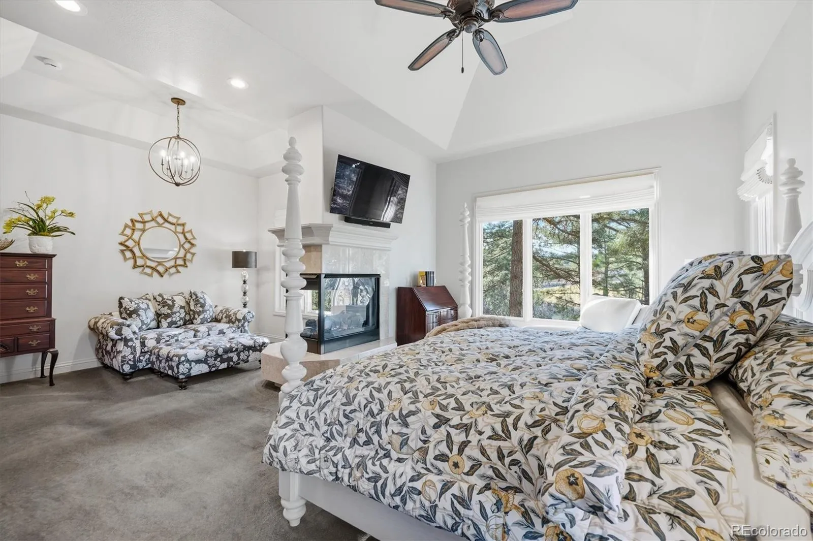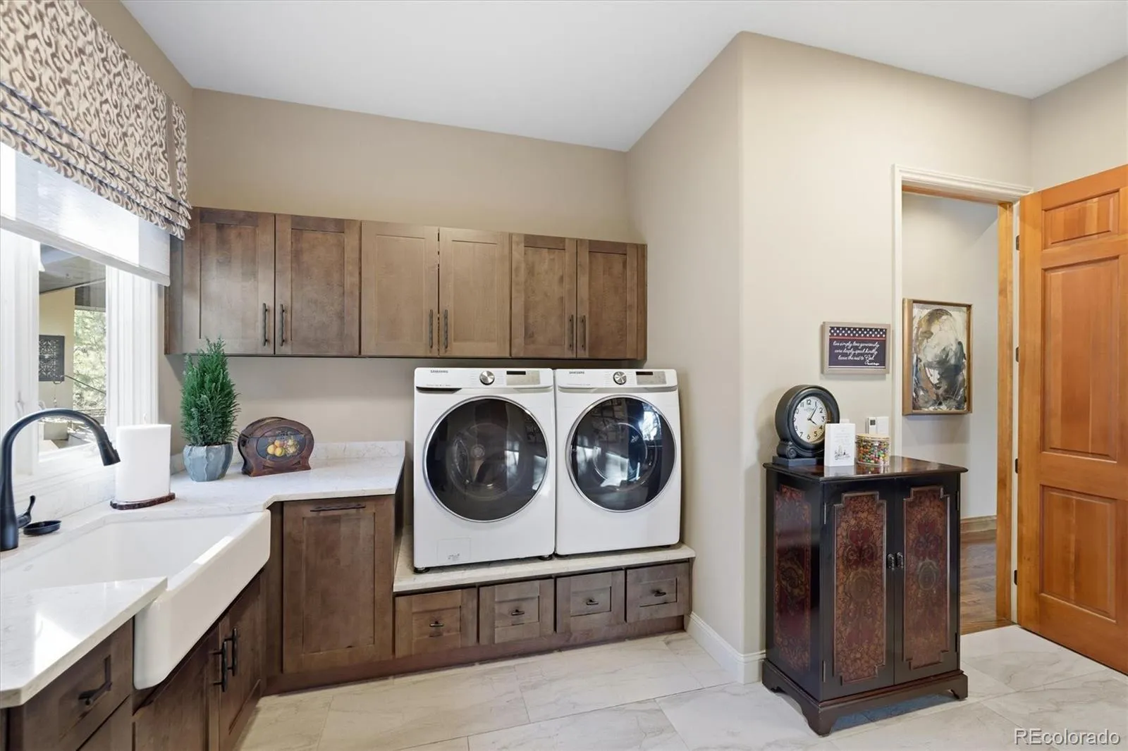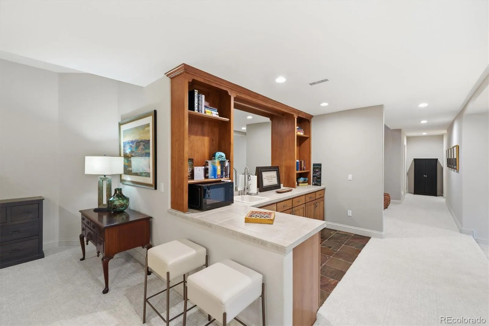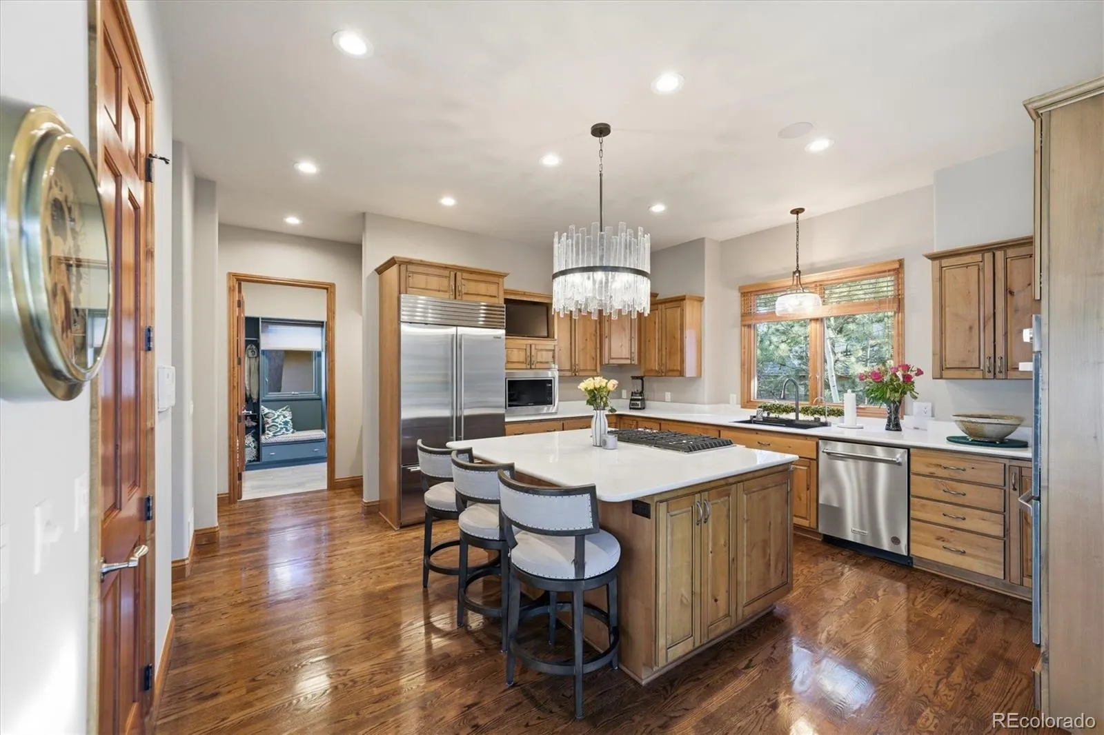 Experience luxury living on the ridge in this exquisite 5,800-square-foot walkout estate, perfectly positioned along the 18th hole of the prestigious Ridge Golf Course in Castle Pines. This masterpiece of design welcomes you with soaring 12-foot ceilings on the main level and an elegant oak curved staircase that sets a sophisticated tone. The gourmet kitchen is a chef’s dream, featuring alder cabinetry, quartz countertops, a Sub-Zero refrigerator, and a high-end Ristafallet Pro smart workstation sink, all supported by a walk-in pantry and a butler’s pantry with a dedicated wine cooler. The primary suite serves as a true sanctuary, offering a double-sided fireplace, a private retreat area, and a spa-like five-piece bath with a massive walk-in closet organizer. For those working from home, the dedicated den provides a quiet workspace with gorgeous cherry built-ins and crown molding, while the family room captures breathtaking golf course views through floor-to-ceiling windows.