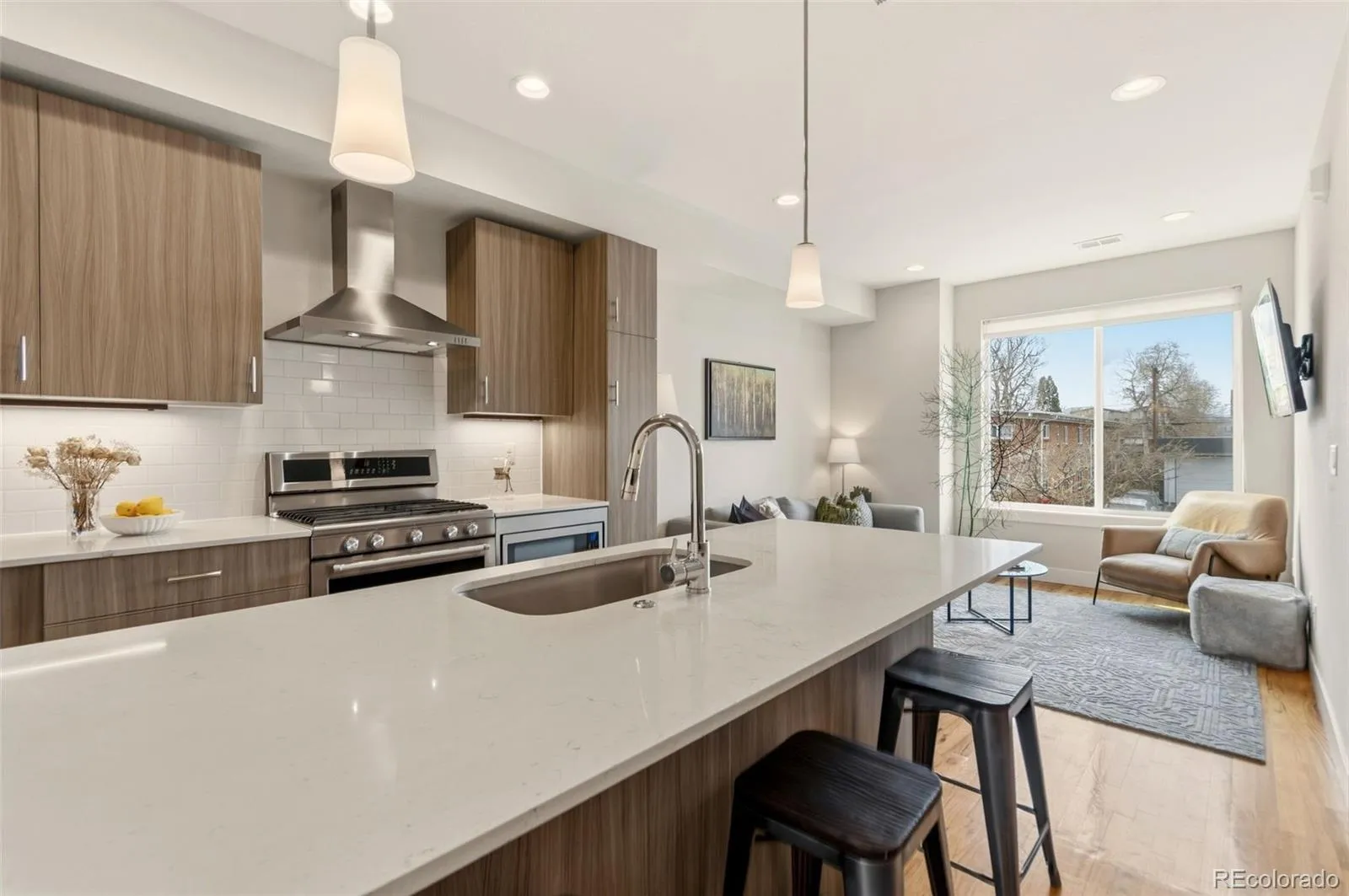 The bright, open floorplan is tailored for both comfort and entertaining, highlighted by real hardwood floors, expansive windows, and clean, modern finishes throughout. The main level centers around a sleek kitchen featuring quartz countertops, stainless steel appliances, a gas cooktop, soft-close cabinetry, and a generous social island with seating. The space flows seamlessly into the dining and living areas and extends to a private balcony complete with a gas line for grilling—ideal for effortless indoor-outdoor living. The entry-level foyer offers flexibility for a home office, gym, or mudroom setup, along with additional coat and storage space.
