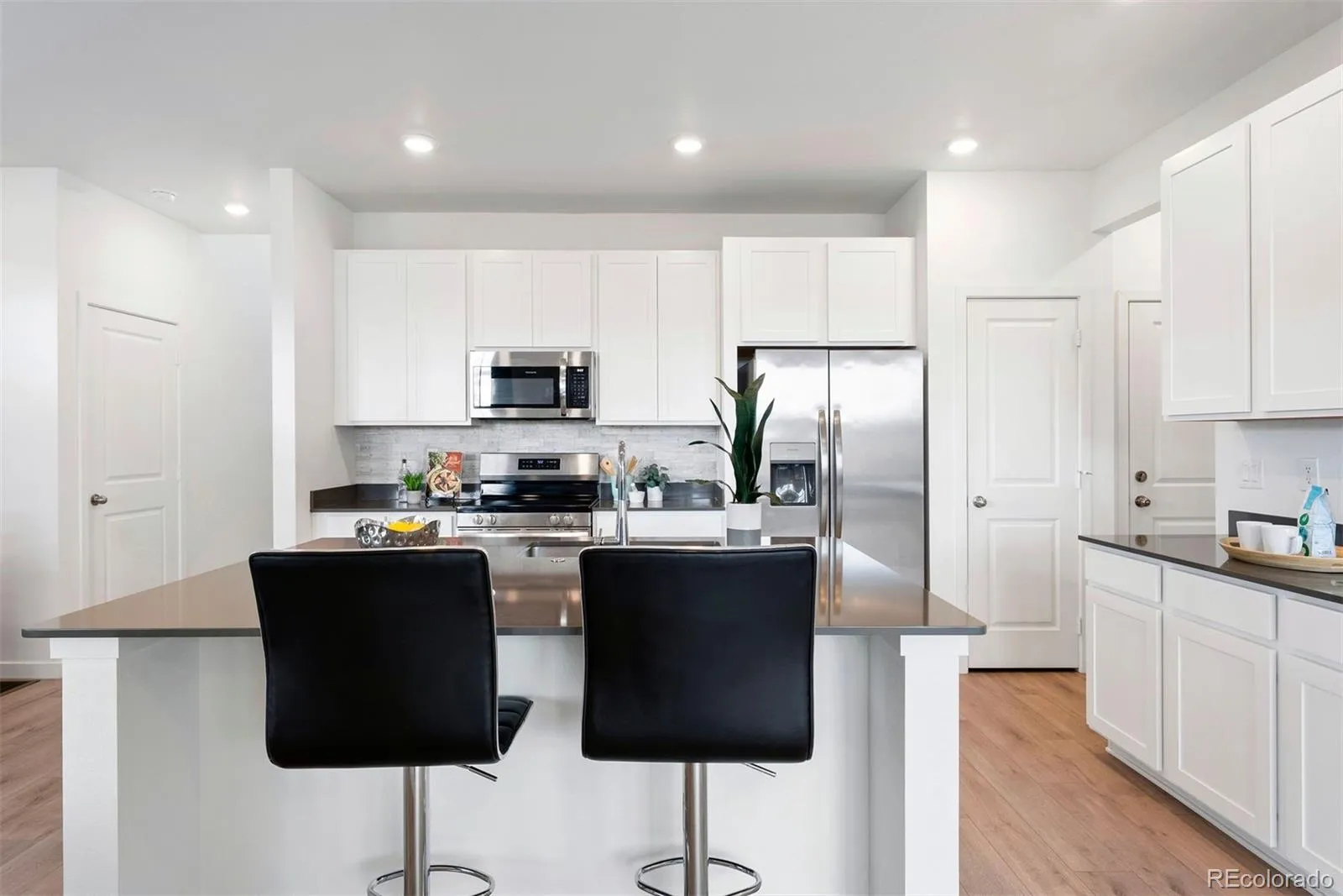 Step onto the oversized covered wraparound front porch — the perfect place to enjoy the Colorado sunrise. Inside, the main level showcases open-concept living at its finest, with the living room, dining area, and kitchen flowing effortlessly together for both everyday living and entertaining. Expansive windows fill the home with abundant natural light, one of the seller’s favorite features. The kitchen is thoughtfully appointed with quartz countertops, GE appliances, ample cabinetry, and a clean, modern aesthetic. Luxury vinyl plank flooring extends throughout the main level for both durability and style.