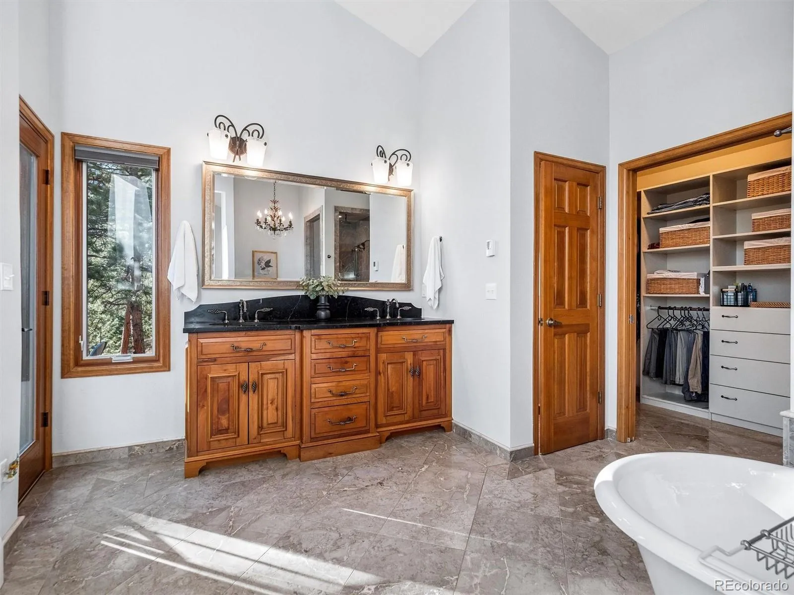 Elevated elegance is showcased in this striking custom-built 4-bedroom, 3-bathroom mountain contemporary home offering 2930 sq ft of refined living space poised on a lovely 1.76 acre lot. Designed to blend seamlessly with its natural surroundings, this home offers a peaceful, serene atmosphere where modern elegance meets mountain tranquility. Expansive windows across the front side of the home bring the outdoors in, flooding the interior with natural light and showcasing stunning natural surroundings with views of Mt Blue Sky. The formal living room/ dining room is anchored by an impressive floor-to-ceiling moss rock gas log fireplace & appointed with durable engineered hardwood flooring. A tailor-made wrought iron staircase adds drama to the space. The custom-designed gourmet kitchen features river rock leathered granite island, countertops & farm sink, customized cherry cabinetry, a Wolf dual-fuel 4-burner range with grill set atop a lovely sage green island, & a Mahogany wood paneled SubZero fridge/pantry, plus an exotic wood butcher-block pastry-station sure to delight the chef in your life. Adjacent to the eat-in kitchen is a cozy family room with a second gas fireplace & built-in bookshelves. Step outside and enjoy your morning coffee on the extensive composite deck as you watch the neighboring elk pass through. The primary suite is a true retreat, occupying the entire upper level. It features vaulted ceilings, tall windows, a slate gas fireplace, a luxurious 5-piece bathroom with a soapstone vanity, a clawfoot bathtub crowned with a gold crystal chandelier, and a separate marble surround shower. Three secondary bedrooms, a full bath, and a laundry room with abundant built-in shelves round out the main level. The spacious 2-car garage provides ample space for all your Colorado toys. The home has been meticulously cared for, & thoughtfully updated. Enjoy close proximity to Elk Meadow, shopping & dining, & an easy Denver Commute.