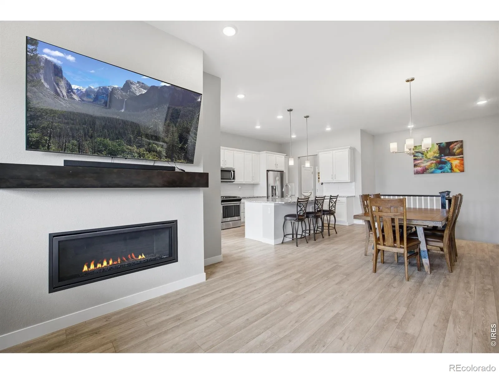 Located in the sought-after Barefoot Lakes community in Firestone, this beautifully maintained 3-bedroom, 2-bath ranch-style home offers the perfect blend of comfort, style, and low-maintenance living. Situated on a desirable corner lot, this home welcomes you with a charming covered front porch and an inviting open layout. Luxury vinyl plank flooring flows throughout the main level, leading into a bright and modern kitchen featuring granite countertops, white cabinetry, a subway tile backsplash, and a gas range. The cozy gas fireplace with a wood mantle adds warmth and character to the main living space. The spacious primary suite is designed for relaxation, complete with dual vanities, a large shower, a stand-alone soaking tub, and a convenient laundry room connecting directly to the primary closet. Downstairs, the garden-level finished basement receives an abundance of natural light and offers a generous recreation area with endless possibilities. Step outside to enjoy the covered back patio with a Trex deck, ideal for summer evenings and weekend gatherings. The attached 2-car garage provides added storage and functionality. Residents of the Barefoot Lakes community enjoy exceptional amenities including a clubhouse, resort-style pool, fitness center, parks, trails, pickleball and basketball courts, plus lake access for paddleboarding and other non-motorized recreation. Even better, front yard lawn care and snow removal are included! This home truly checks all the boxes: style, space, and an incredible community lifestyle!