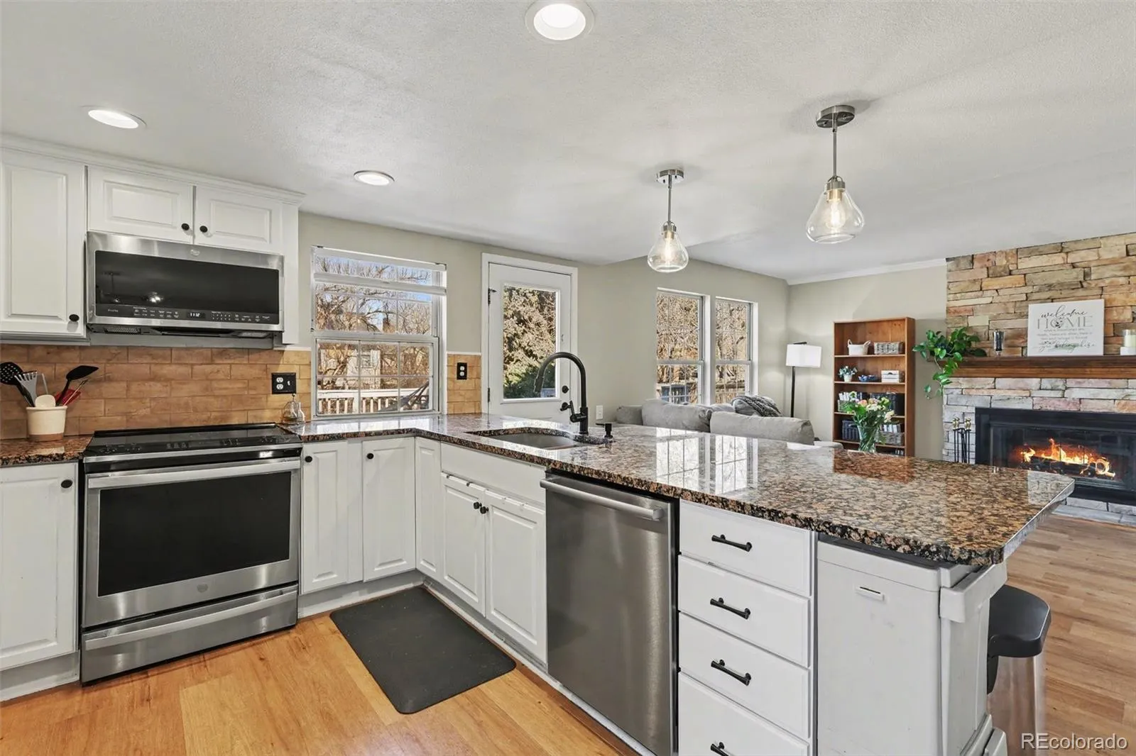 The remodeled kitchen features granite countertops, stainless steel appliances, and an eat-in dining area anchored by a cozy wood-burning fireplace with custom tile surround. Retreat into the spacious remodeled primary suite, which will have you in vacation mode enjoying a large soaking tub with powerful jets and the recently remodeled shower with detachable rain shower head and beautiful custom tile. Heated towel rack for those cold Colorado mornings. Large walk-in closet provides ample storage. 2 additional, light-filled South facing bedroom and another full bath as well as a versatile loft space acts as an office, craft space, or reading nook to round out the top floor.