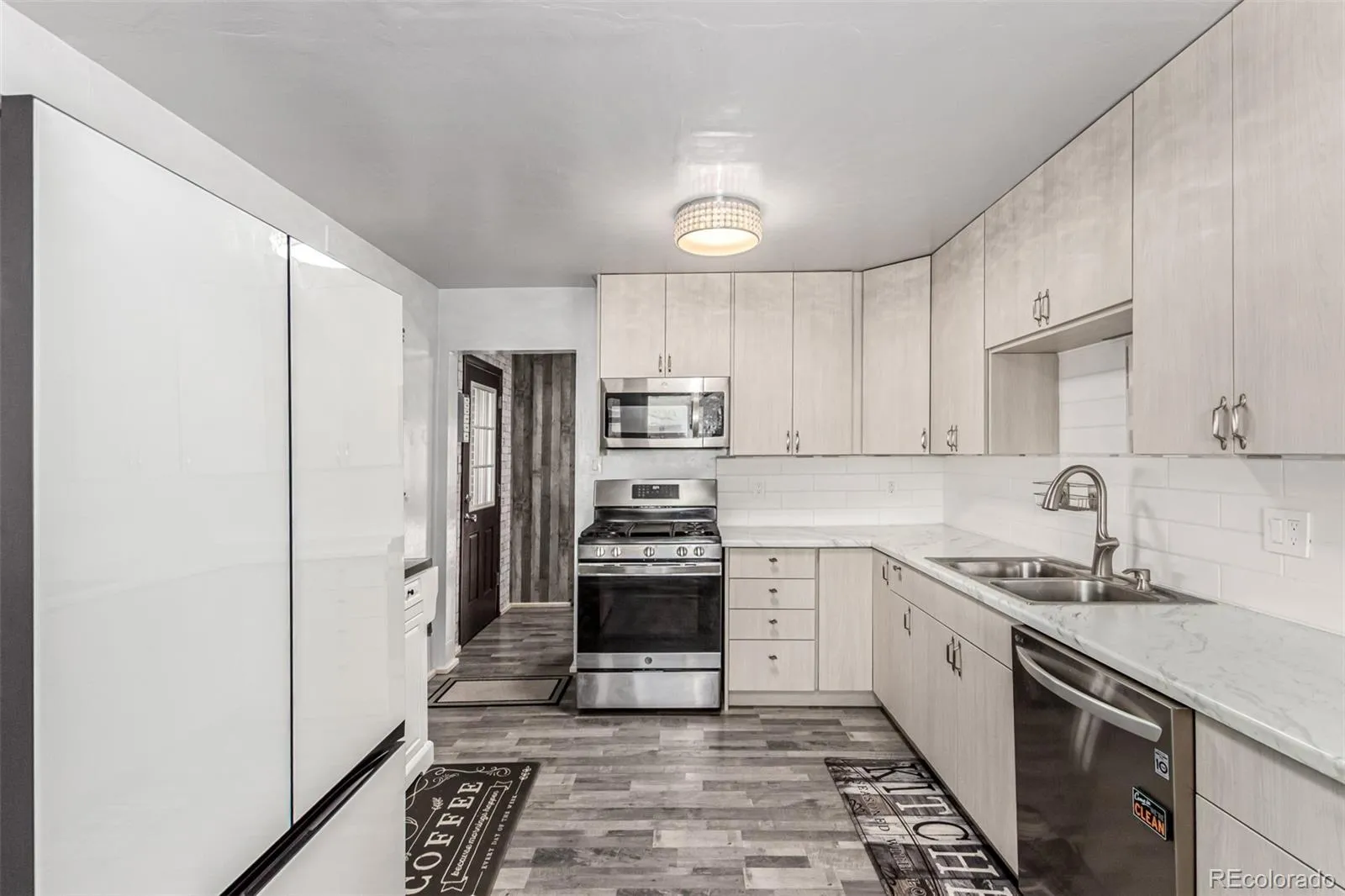 Inside, vinyl floors set a warm, modern tone, flowing into a cozy living room that’s just right for movie nights, game days, or curling up with your favorite book. The layout feels open yet comfortable, easy to live in, and easy to love. The kitchen shines with stainless steel appliances, crisp white cabinetry, a timeless subway tile backsplash, and generous counter space that makes cooking feel less like a chore and more like a joy. There’s plenty of room to prep, plate, and gather while the conversation flows.