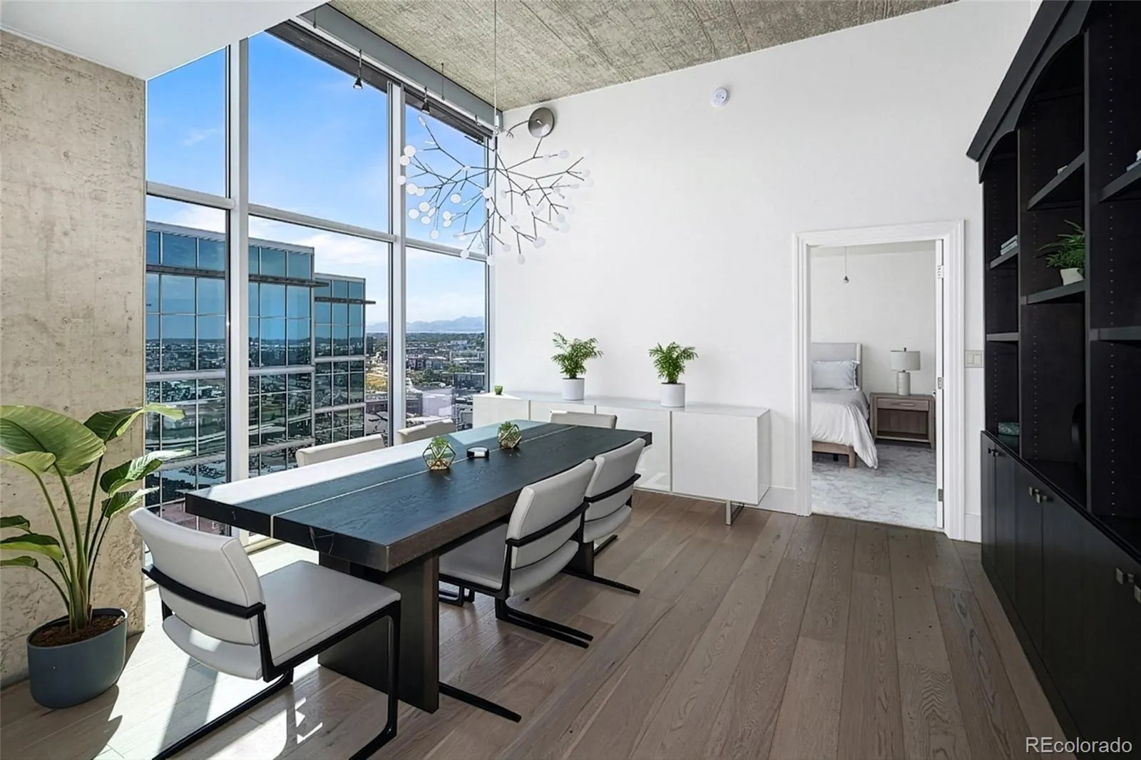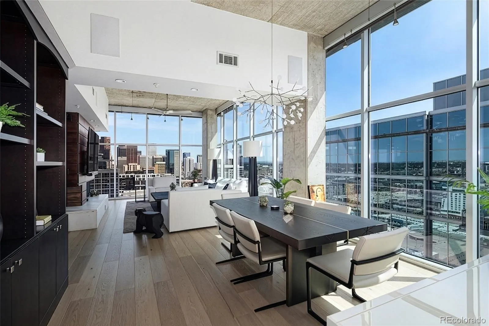 Positioned high above the city, this corner penthouse commands unobstructed panoramic views of the Rocky Mountains, Commons Park, and the downtown skyline, including Coors Field. Expansive floor-to-ceiling glass creates a dramatic backdrop of natural light by day and city illumination by night.