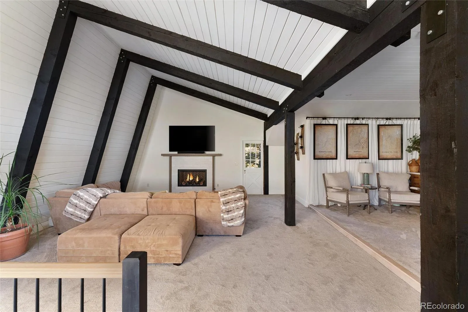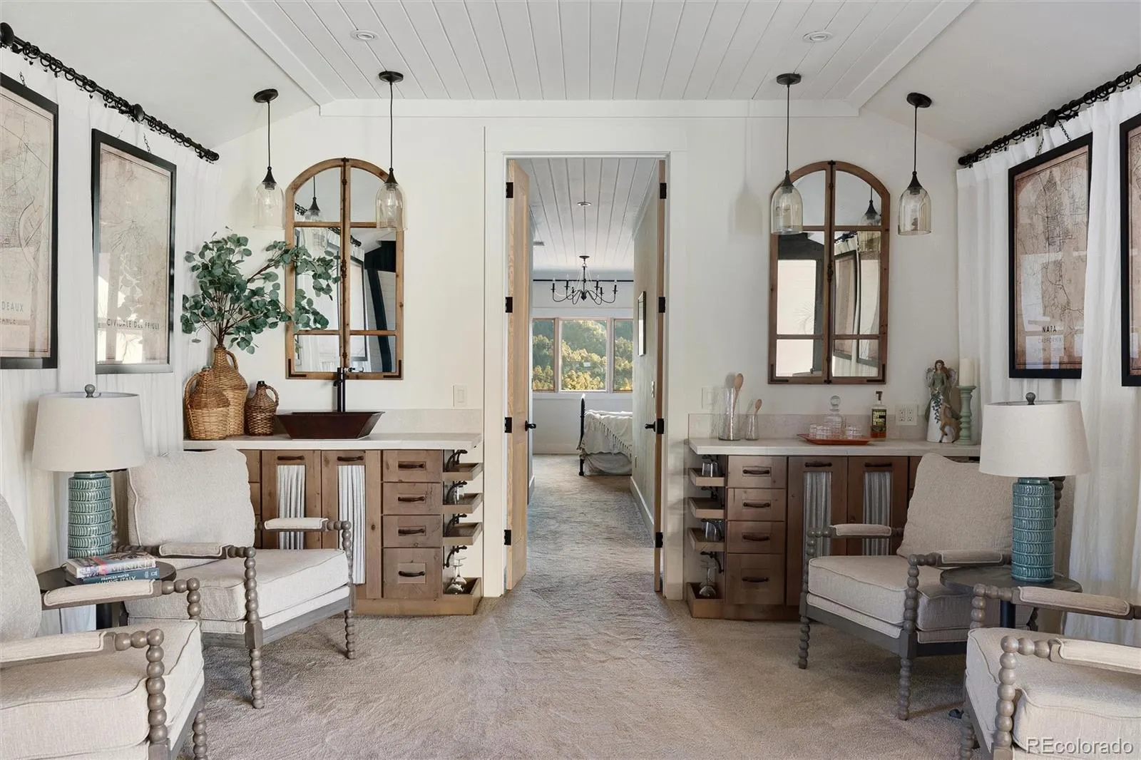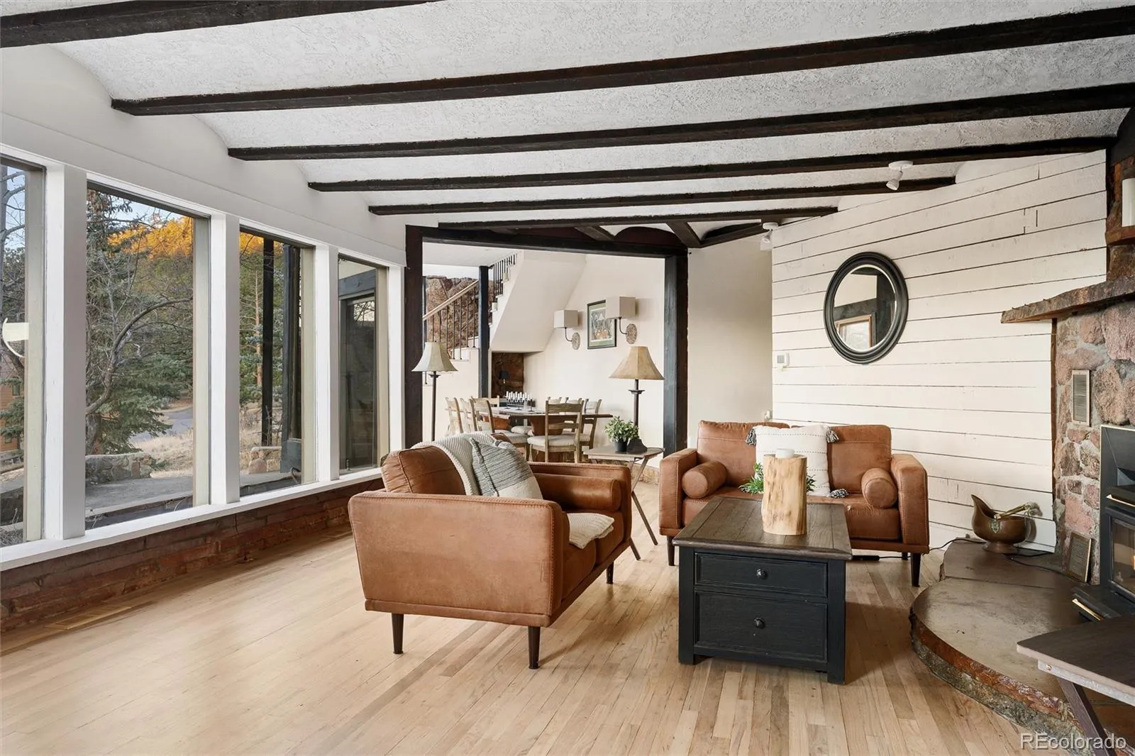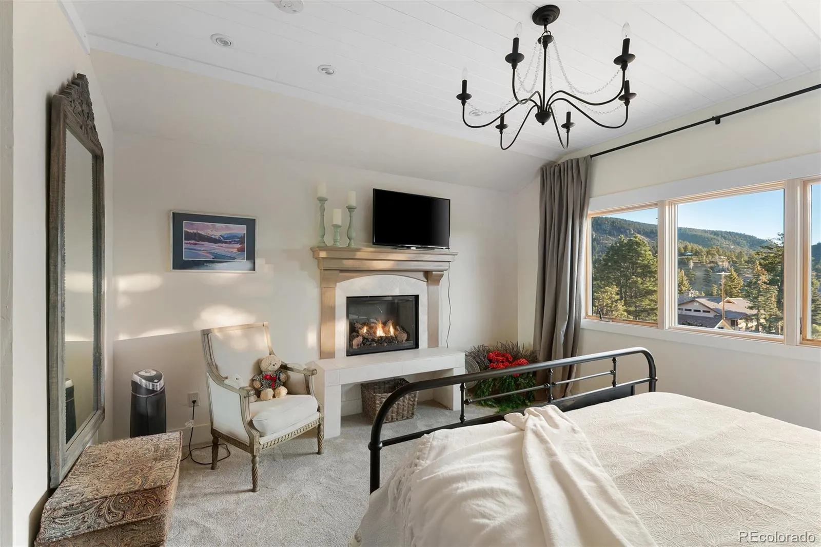 Experience refined mountain living in this exquisitely remodeled two-story mountain contemporary offering 4 bedrooms and 4 baths, including two exceptional primary suites designed for comfort and privacy. The main level primary retreat is a serene sanctuary featuring a spa inspired five-piece bath adorned with European travertine, radiant heated floors and a deep soaking tub for ultimate relaxation. Upstairs, an entire level is devoted to a grand primary haven complete with a gas fireplace, expansive custom walk-in closet, a newly reimagined European-designed bath showcasing heated travertine flooring, hand-carved travertine sinks, skylights, and bespoke Alder wood built-ins finished in a custom French Oak stain. Designed for both ambiance and warmth, the home features three fireplaces, two gas and one wood burning creating inviting gathering spaces throughout. Walls of dramatic floor-to-ceiling windows and solid timber beams frame breathtaking mountain vistas while filling the interior with natural light. The seamless flow between living, dining, and kitchen spaces creates an ideal setting for entertaining and effortless everyday luxury. The open concept kitchen is beautifully appointed with rich Maple cabinetry and a thoughtfully designed butler’s pantry, blending elegance with functionality. A sun kissed terrace extends the living experience outdoors, inviting peaceful mornings with panoramic views and evenings beneath Colorado’s star filled skies. Two additional main level bedrooms provide flexibility for guests, office space, or multigenerational living, complemented by an updated full bath, heated floors and a stylish powder room. Ideally located near the coveted Upper Bear area, this residence offers proximity to Evergreen Lake’s year round recreation, downtown boutiques and cafés, award winning schools, and convenient access to I-70. A rare opportunity to own an elevated Colorado mountain retreat where design, lifestyle, and location converge beautifully.