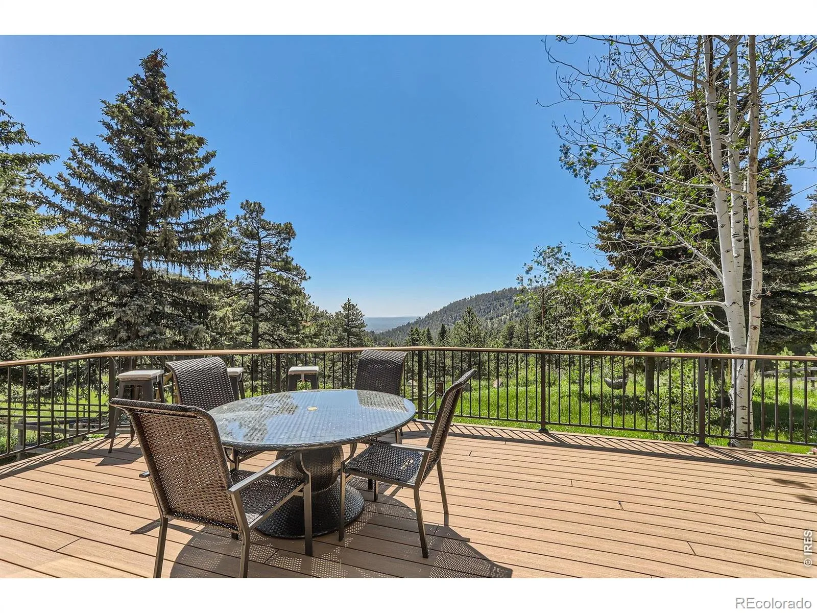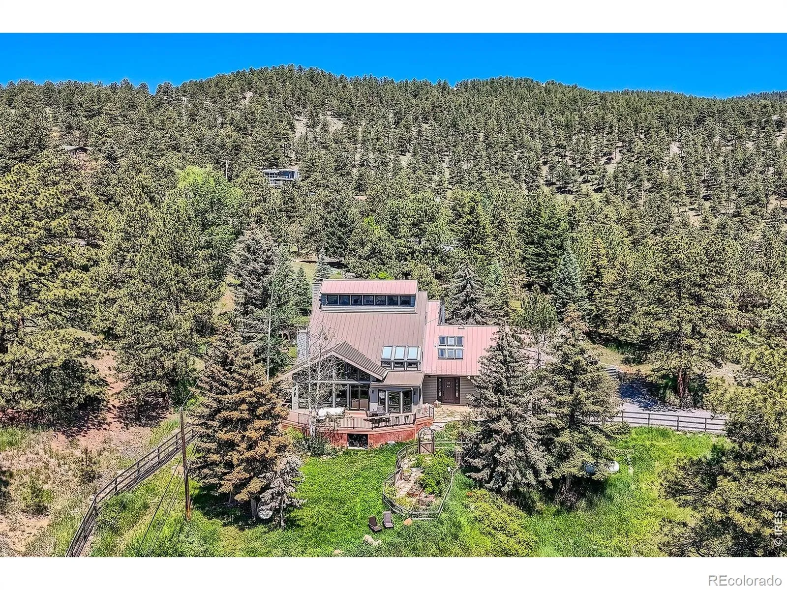 Beautifully renovated Sunshine Valley home, perfectly positioned on nearly two private acres just moments from Pearl Street Mall. Where elevated mountain living meets refined design: an exceptional five-bedroom home with a versatile bonus space, framed by sweeping views of Boulder and the plains below. Soaring, beamed ceilings and dramatic floor-to-ceiling windows anchor the great room, inviting natural light to pour in while capturing breathtaking vistas in every season. Rich wood and stone textures create a warm, alpine sophistication, blending timeless craftsmanship with an elevated aesthetic. The formal dining room, illuminated by a statement chandelier, sets the stage for unforgettable evenings against a backdrop of mountain skies. The eat-in kitchen is both functional and beautifully appointed, featuring a generous prep island, breakfast bar, and sunlit breakfast nook for effortless mornings and lively gatherings. A charming main-level bedroom with a wood-burning stove offers comfort and flexibility, ideal for guests or a private study. Ascend the handcrafted log staircase to a secluded upper-level retreat. The primary suite unfolds through a light-filled flex space, perfect for an office or wellness room, into serene sleeping quarters with dual closets, a wood-burning fireplace, and a Juliette balcony with stained glass overlooking a tranquil, tree-lined setting. The five-piece bath delivers spa-level indulgence with an oversized shower and soaking tub. Additional upper-level bedrooms include one with private deck access to the backyard sanctuary, while the top level offers a fifth bedroom plus a non-conforming sixth, ideal for guest quarters, creative space, or a studio. Outdoors, a fenced yard and flourishinggarden complement the natural landscape, creating a setting that feels both expansive and intimate. Just minutes from downtown Boulder’s vibrant downtown, this rare offering delivers privacy, scale, and proximity-an extraordinary mountain estate.