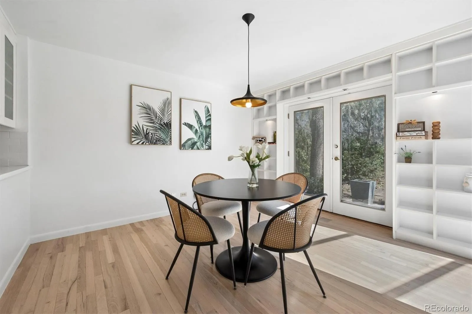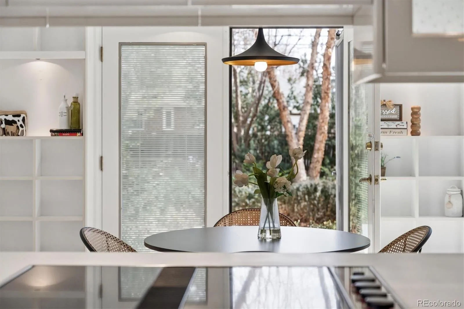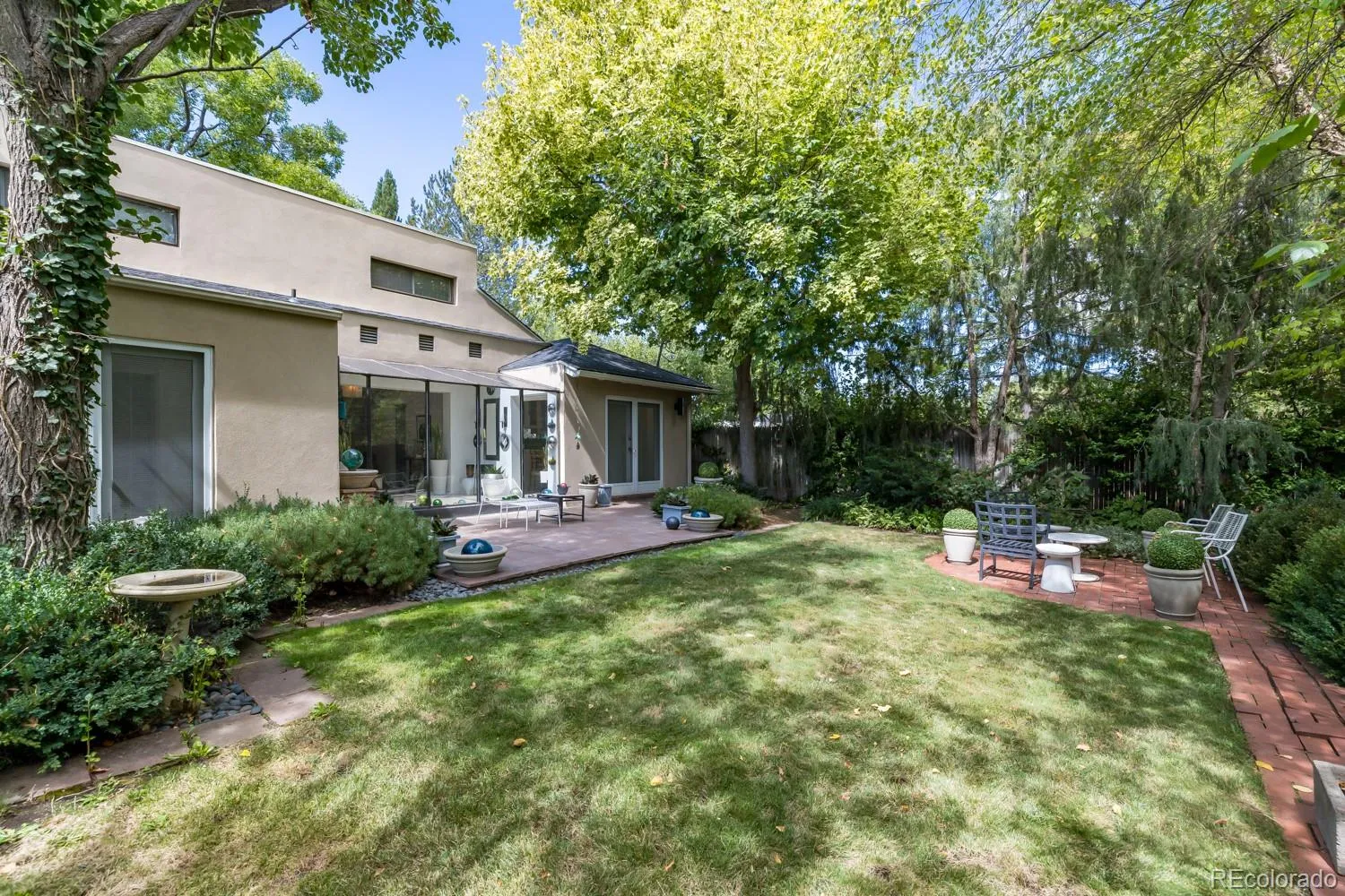 Unique architect designed, custom contemporary home with an amazing garden in one of Central Denver’s finest neighborhoods. Originally built in the 1950s and thoughtfully remodeled over the past three decades, the home presents as a private sanctuary, where curated gardens and a refined, modern interior exist in perfect balance. Inside, clean lines and expansive, light-filled spaces are complemented by striking architectural elements, including angled ceilings and a sleek gas fireplace anchoring the main living area. The kitchen is both functional and stylish, featuring a center island, hard-surface countertops, crisp white cabinetry, and high-end appliances, with a charming breakfast nook that opens to the backyard via French doors.