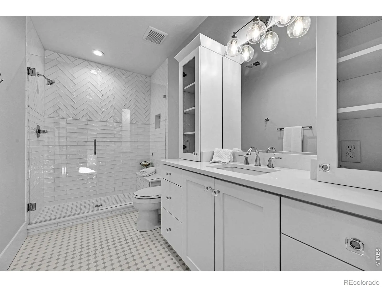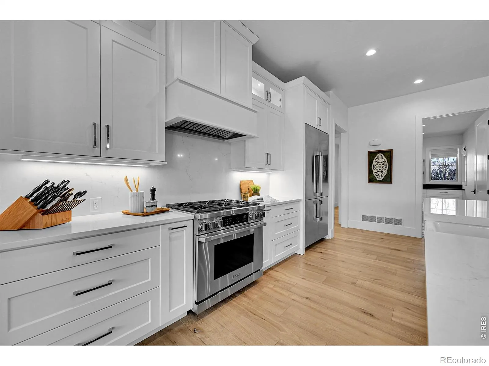 Welcome to 6582 Rookery Rd, a 5-bedroom, 6-bath, 5,012 sq ft ranch-style home designed for exceptional single-level living in the prestigious Sanctuary at Fossil Lake Ranch. Set on a private, professionally landscaped 0.53-acre lot, this beautifully remodeled Lauren Ashley Homes residence is located in one of Fort Collins most sought-after neighborhoods. Enjoy an unbeatable location within walking distance to Zach Elementary, Preston and Kinard Middle Schools, and Fossil Ridge High School, with quick access to the Harmony Corridor, major employers, medical centers, and I-25. Blending modern farmhouse charm with elevated contemporary finishes, the home features flat white walls, elegant wood paneling, and wide-plank white oak engineered wood flooring. The open-concept gourmet kitchen showcases premium Dacor appliances, custom Milarc cabinetry, quartz countertops and backsplash, an oversized island, and a built-in bar refrigerator. A walk-in pantry with appliance garage and coffee bar adds everyday convenience. The light-filled living area is anchored by a floor-to-ceiling stone fireplace, floating shelves, custom built-ins, and expansive windows overlooking the serene backyard. The main level offers true single-floor living with a luxurious primary suite, second en-suite bedroom, powder room, dedicated office or optional bedroom, laundry suite, and a stunning mudroom. Outdoors, a covered patio with dining and lounge areas, string lighting, and a fire pit creates the perfect year-round entertaining space. The finished lower level provides additional flexibility with a family/media room, wet bar with dual beverage refrigerators, home gym, two en-suite bedrooms with walk-in closets, an additional powder room, and a second laundry area. Thoughtfully designed throughout, this home seamlessly blends luxury, comfort, and functionality just minutes from everything Fort Collins has to offer.