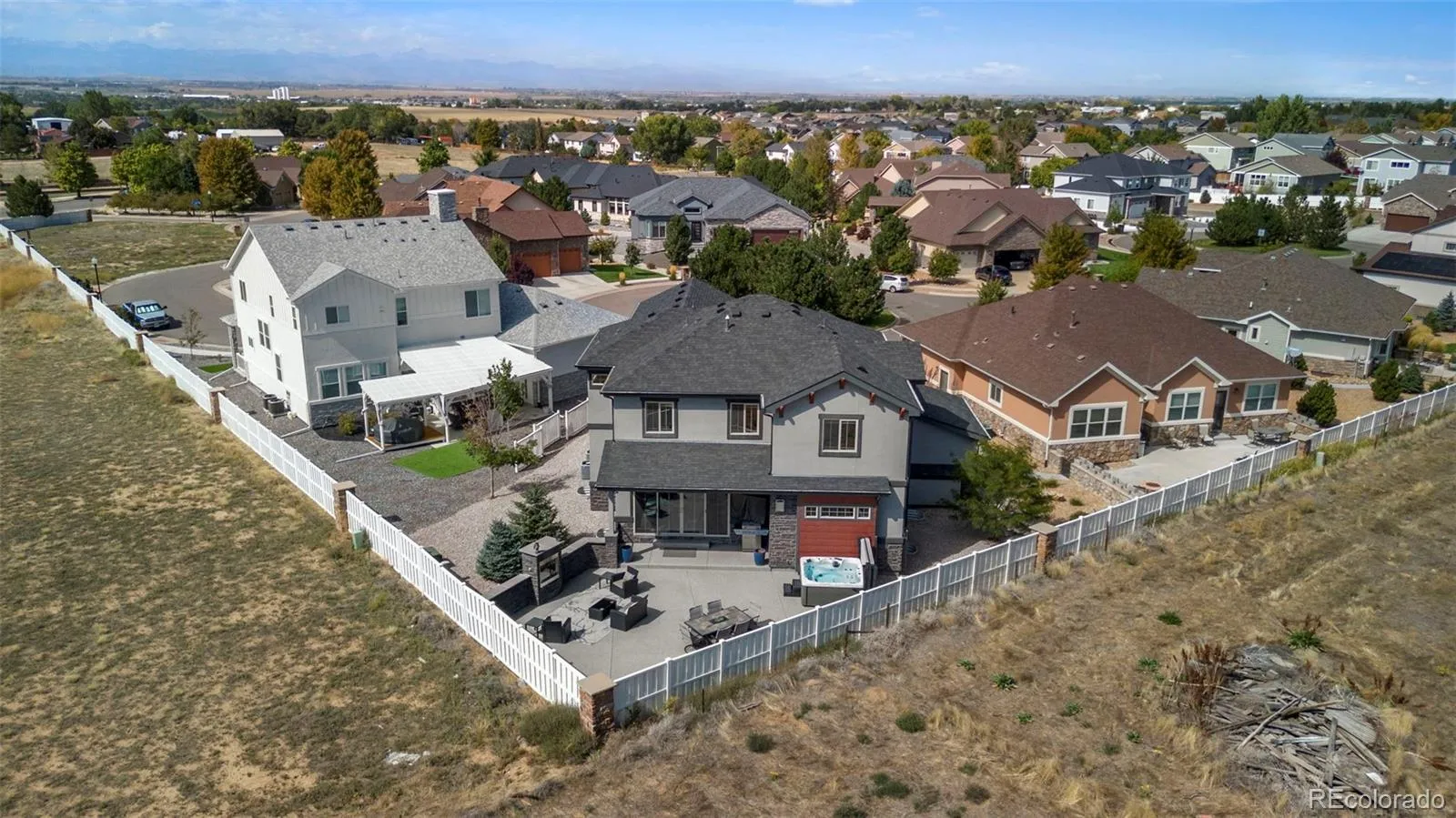 Nestled in the picturesque Chapel Hill community of Brighton, this exquisite custom home exemplifies refined living. Thoughtfully designed with high-end finishes throughout, this residence boasts four bedrooms, three bathrooms, and an unfinished basement, offering ample space and limitless potential. The open-concept main floor is an entertainer’s dream, seamlessly blending elegance and functionality. A chef’s kitchen—complete with premium appliances, quartz countertops, and custom cabinetry—flows effortlessly into the dining area, where a 6-foot sliding glass door extends the living space onto a covered back porch, perfect for al fresco gatherings. The primary suite is a true sanctuary, featuring coffered ceilings, breathtaking mountain views, and a spa-like en-suite with dual vanities, a luxurious soaking tub, an oversized shower, quartz countertops, a stylish barn door, and an expansive walk-in closet. Outside, a private outdoor oasis awaits, complete with a hot tub and two fireplaces, creating an idyllic retreat for year-round enjoyment. A three-car garage provides abundant storage for vehicles, recreational gear, and more. Ideally located with easy access to major highways, this home offers unparalleled convenience—just 20 minutes to DIA and 25 minutes to downtown Denver.