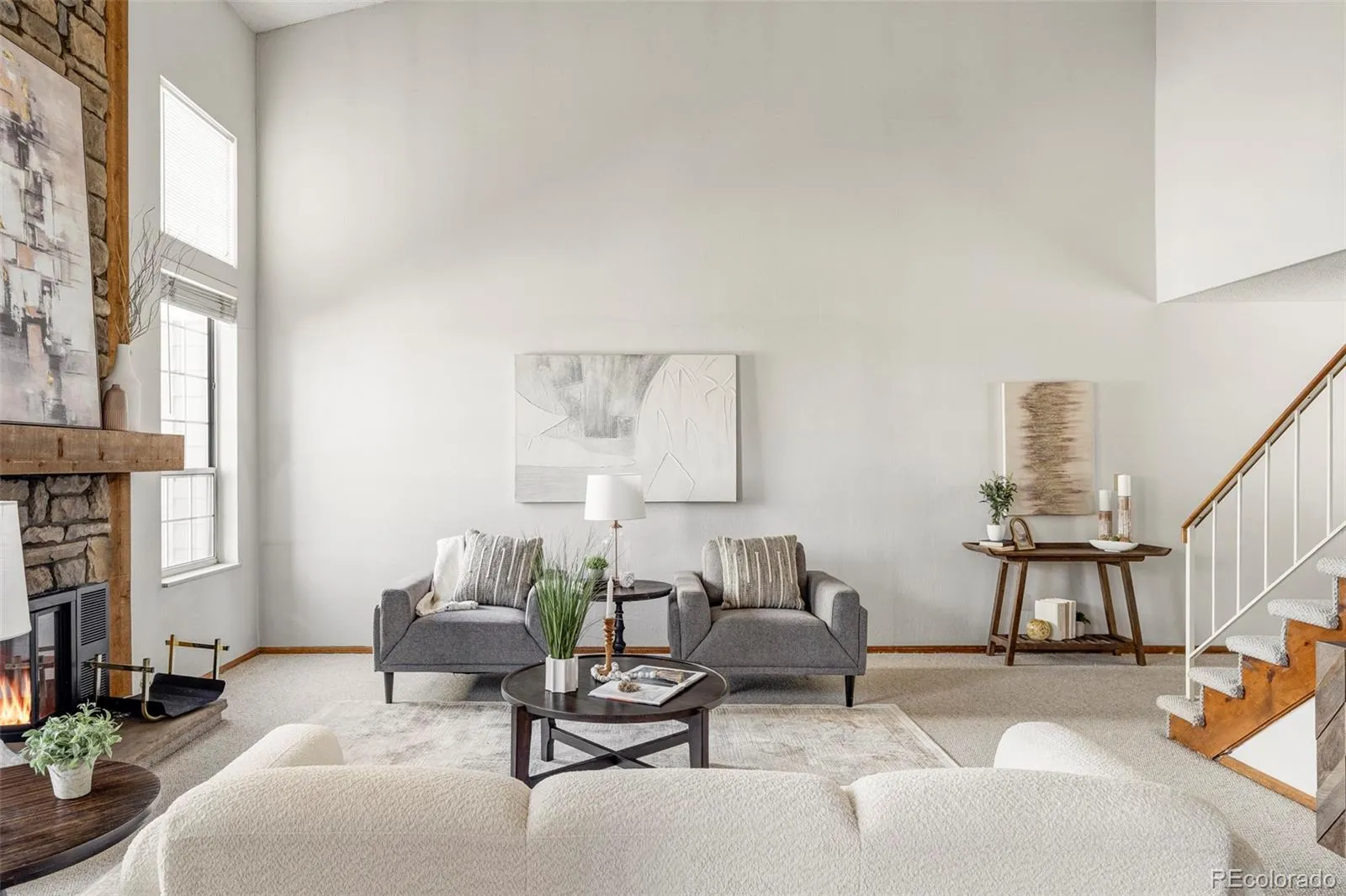 Inside, the floorplan truly shines. The main level features vaulted ceilings and a cozy fireplace in the living room, creating an open, inviting feel. You’ll also find a dedicated dining area, kitchen, convenient half bath, and access to a private patio – perfect for enjoying Colorado evenings. The attached two-car garage adds everyday convenience and extra storage.