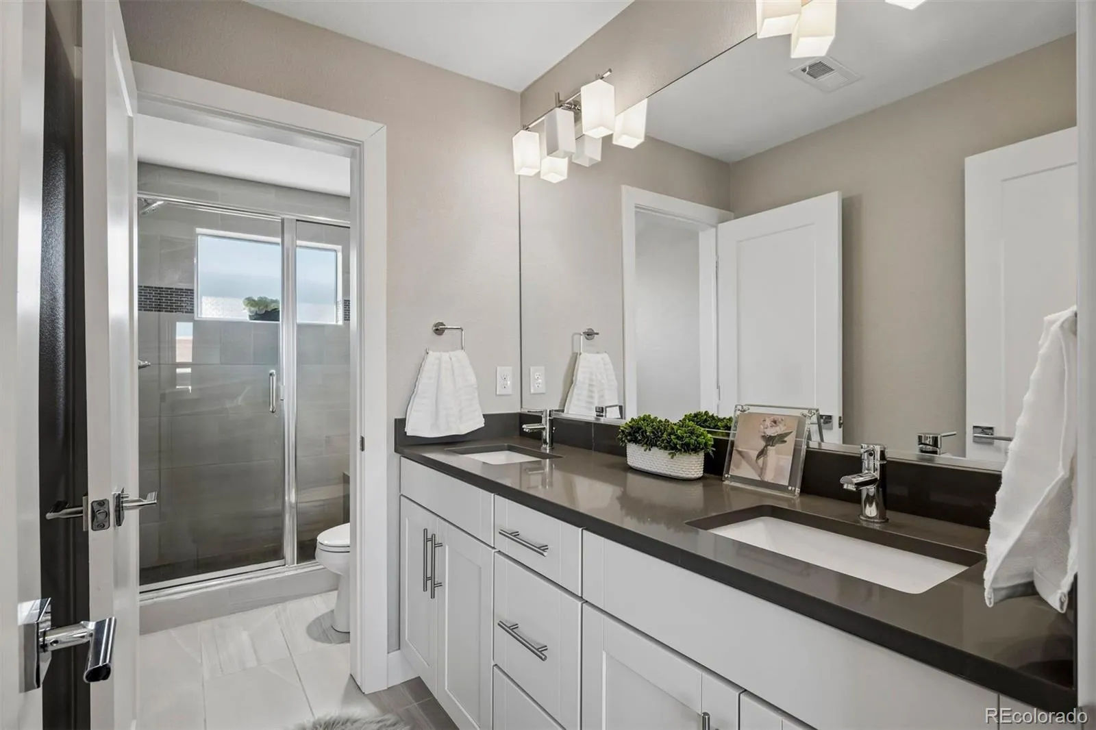 The open and modern layout features 2 bedrooms, each with its own ensuite bathroom, providing ideal privacy for guests, roommates, or family. The home has 4 bathrooms in total, including a convenient half-bathroom in the attached two-car garage. Brand new carpet. A small grass outdoor area offers the perfect spot for pets.