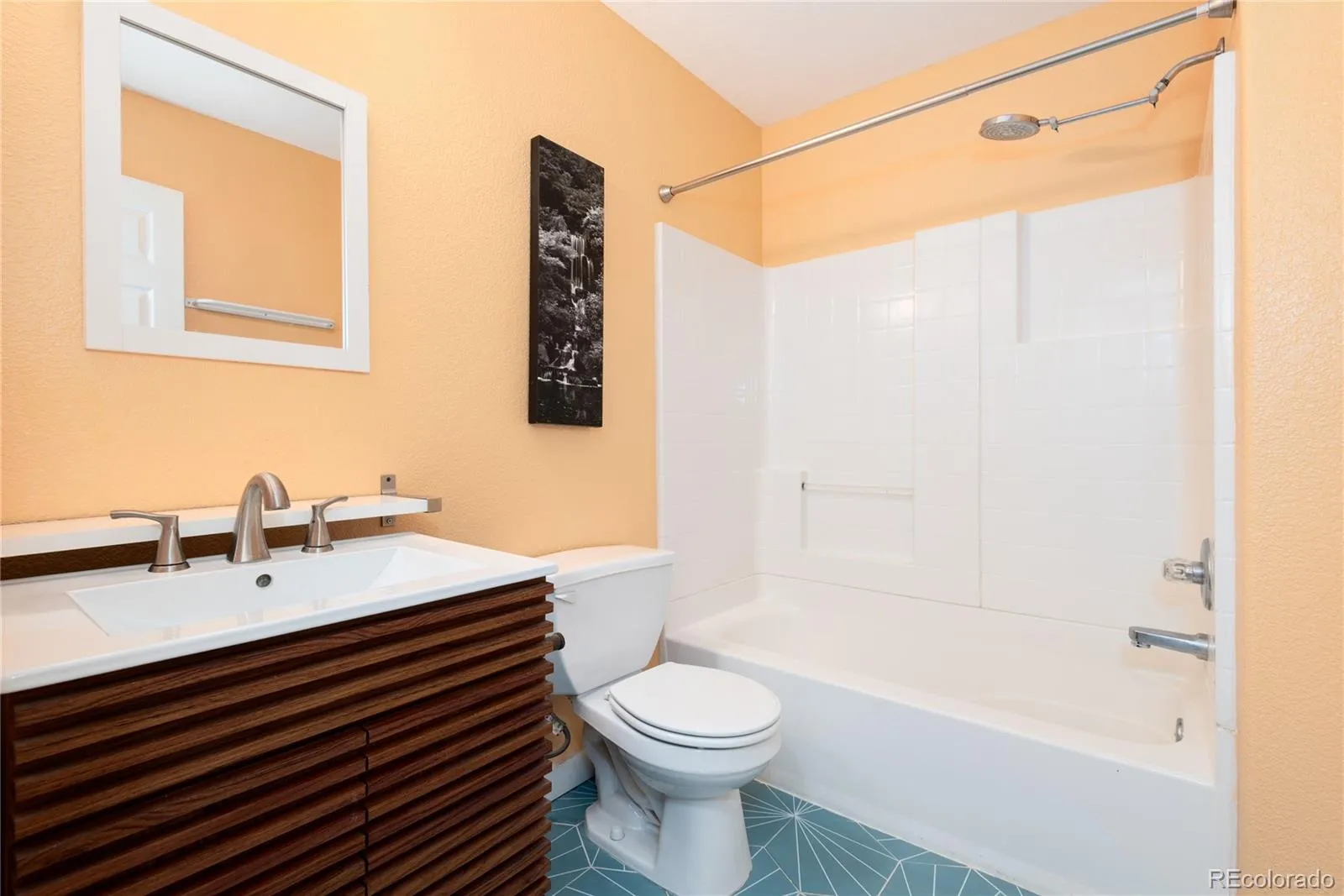 The primary suite easily accommodates a king-size bed and includes a private en suite bathroom with a walk-in shower, designer tile, updated sink, mirror, and modern fixtures. A second full-sized bathroom serves the additional bedrooms.