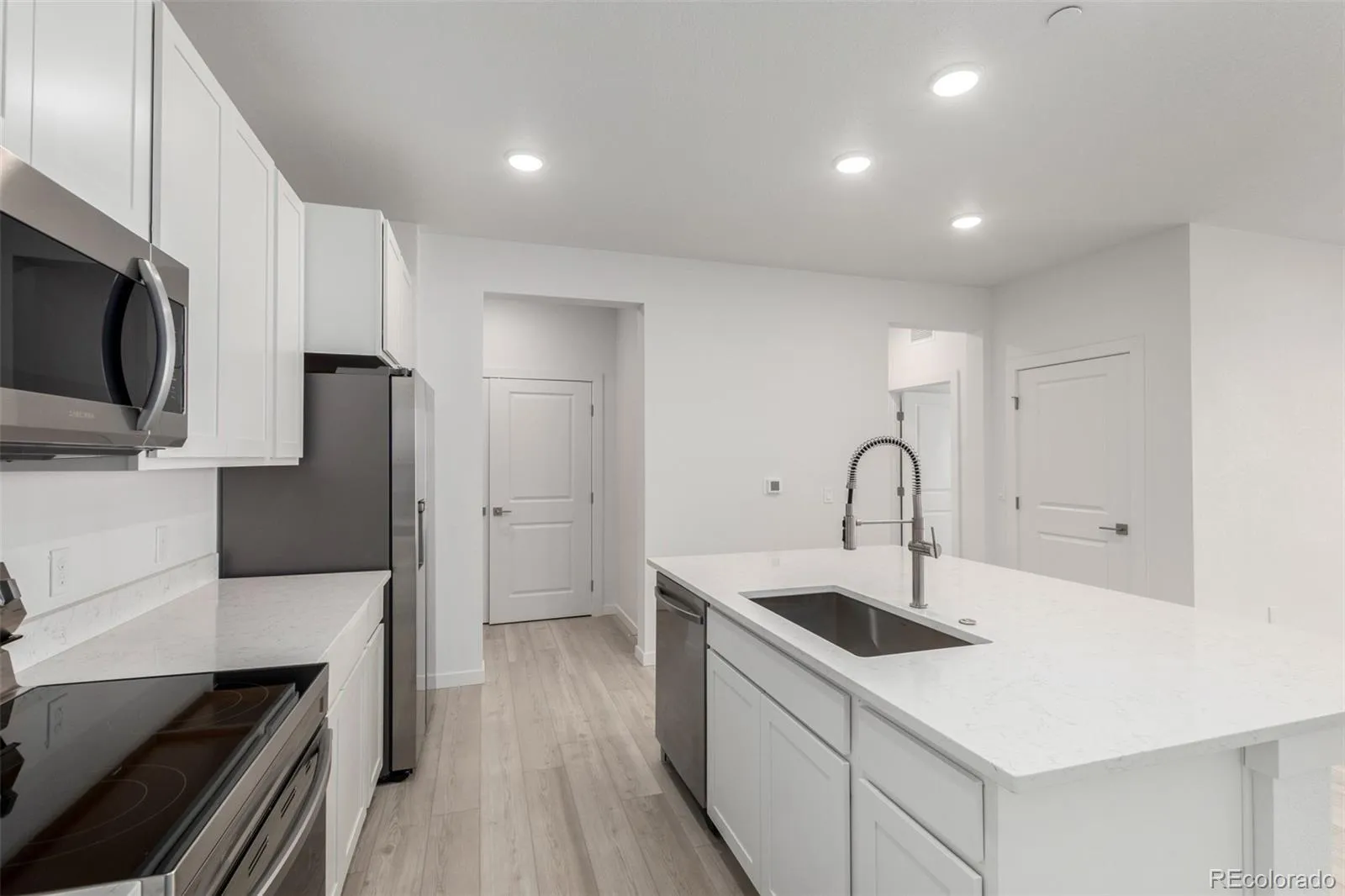 Experience modern living in this top-floor new construction condo in Northeast Denver, built by Lokal Homes. This thoughtfully designed 2-bedroom, 2-bathroom residence offers 1,085 sq. ft. of open-concept living space with stylish finishes, abundant natural light, and a detached garage for secure parking and additional storage. The bright great room flows seamlessly into a contemporary kitchen featuring upgraded white quartz countertops, Kohler fixtures, soft-close cabinetry, and stainless steel Samsung appliances including refrigerator. Luxury vinyl plank flooring extends through the kitchen and main living areas, creating a sleek, low-maintenance space ideal for everyday living and entertaining. Designer lighting, upgraded cabinetry, and modern hardware add a polished feel throughout. The spacious primary suite serves as a private retreat with a generous closet and a well-appointed en-suite bathroom. A second bedroom and full bath provide flexibility for guests, roommates, or a home office. The in-unit stackable washer and dryer closet adds everyday convenience. Located in one of Denver’s fastest-growing areas near the Peña Station light rail corridor, this community offers convenient access to Denver International Airport, I-70, E-470, and downtown Denver. Residents enjoy proximity to GVR Recreation Center, GVR Golf Club, local dining, breweries, parks, and new neighborhood development, including a K-8 school currently under construction nearby. Commuting and travel are effortless with the A-Line train to DIA and Union Station just minutes away. This top-floor condo combines modern design, low-maintenance living, and a prime Denver location, making it a great opportunity for homeowners or investors seeking new construction near DIA and the expanding northeast Denver corridor. Photos shown are of a different home with the same floor plan, views may vary. Ask about special financing incentives available from the builder’s preferred lender.