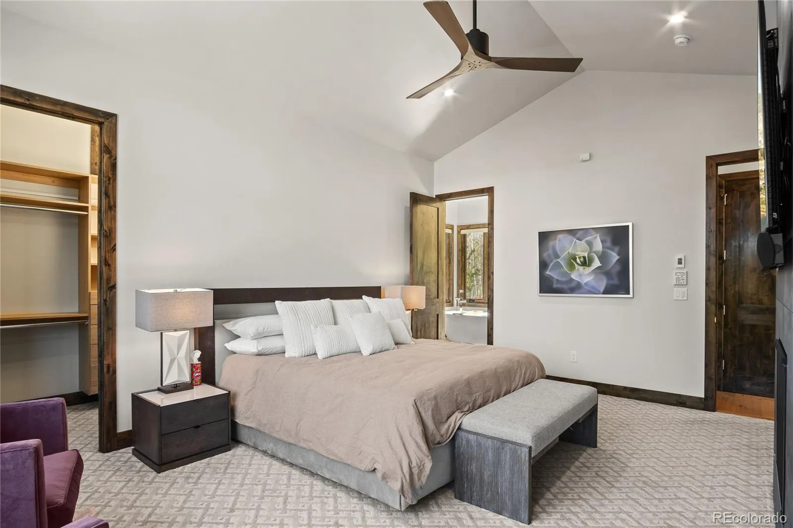 Spectacular mountain-modern retreat showcasing breathtaking views of Buffalo, Chief, and Wichita Mountains, located in the highly desirable Reserve at Frisco. Designed to capture both the scenery and natural light, the home’s spacious great room features soaring vaulted ceilings, expansive windows, and a cozy fireplace that creates a warm and inviting atmosphere. A double-opening sliding glass door seamlessly connects the great room to the outdoor patio, blending indoor and outdoor living and providing the perfect setting for entertaining or simply taking in the surrounding mountain views. The chef’s kitchen is both elegant and functional, appointed with Monogram appliances, custom cabinetry, quartz waterfall countertops, and a generous eat-in bar ideal for gathering with family and friends. Elevator access between both levels adds everyday convenience, making moving throughout the home and bringing in groceries effortless. The main-level primary suite offers a private retreat, complete with a luxurious spa-inspired five-piece en-suite bath featuring a soaking tub and oversized walk-in shower. Downstairs, the lower level provides a comfortable family room perfect for movie nights or relaxing after a day in the mountains. Three additional bedrooms are thoughtfully designed for privacy with each offering their own en-suite bathroom, providing comfort and convenience for guests or family members. Modern living is enhanced by Savant smart-home technology, seamlessly integrating lighting, audio, blinds, climate control, and security throughout the home. The covenant-protected neighborhood offers open space and walking trails that weave throughout while being within a short walk to Main Street for shopping, dining and entertainment and also nearby, Whole Foods and growing Basecamp Shops. Enjoy the fabulous Frisco Marina or Frisco Adventure Park in the summer while being within 30 minutes of 5 world-class ski resorts in the winter.