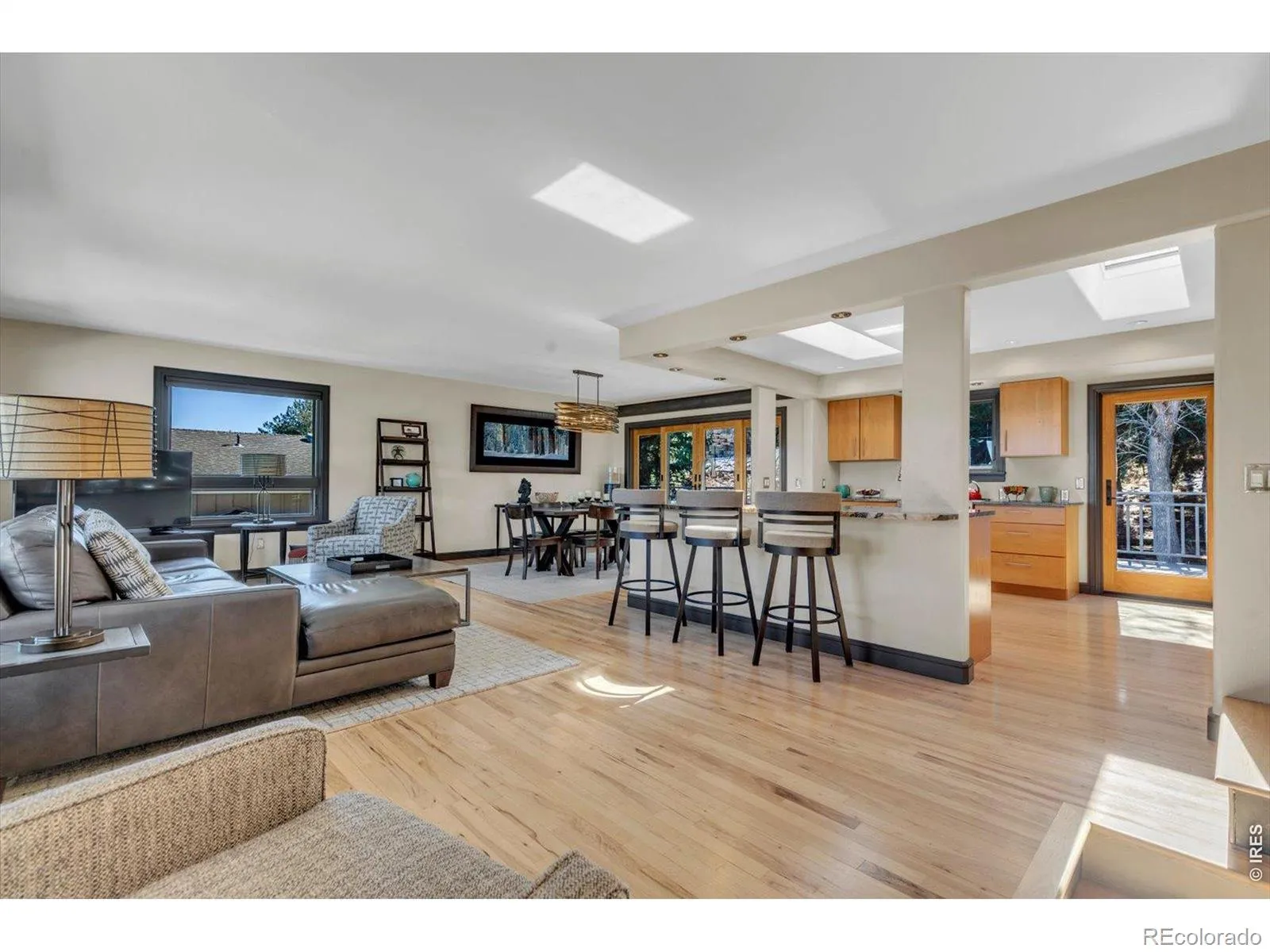 Perched above Viele Lake on a large private lot in the desirable Rolling Hills neighborhood, this exceptional mid-century modern home sits on a quiet cul-de-sac and offers sweeping views of the mountains, plains, and city lights. Expansive windows capture the spectacular scenery while filling the home with natural light. The bright, open floor plan with beautiful hickory floors seamlessly connects the living, dining, and kitchen areas, creating an inviting space for everyday living and entertaining. The well-appointed kitchen features a large chef’s island with breakfast bar seating, exotic granite countertops, a coffee bar, skylights, and recessed lighting. Windows from the kitchen overlook the peaceful wooded backyard where deer are often seen resting. The dining area opens through four-lite sliding doors with a 5 ft opening to a large deck, creating an effortless connection to outdoor living and al fresco dining. Enjoy the views of the mountains, plains, and Viele Lake by day and sparkling city lights by night from the comfort of the living room. The spacious primary suite offers a private retreat with a sitting area, large windows framing remarkable views, a walk-in closet, and an ensuite bath with radiant floor heat and a luxurious steam shower. An expansive family room provides a welcoming gathering space with a gas fireplace and patio doors opening to the serene backyard, perfect for entertaining, movie nights, or a hi-fi listening room. A finished and heated 23′ x 16′ bonus room off the garage, with its own entrance, offers flexible space for a home office, gym, studio, or workshop. The large lot features tiered outdoor living areas, including a generous deck and flagstone patio overlooking the tranquil backyard. Ideally located near trails, parks, the South Boulder Rec Center, Viele Lake, and within walking distance to Fairview High School. A new Class A roof was just installed. A rare opportunity to enjoy the very best of Boulder living.