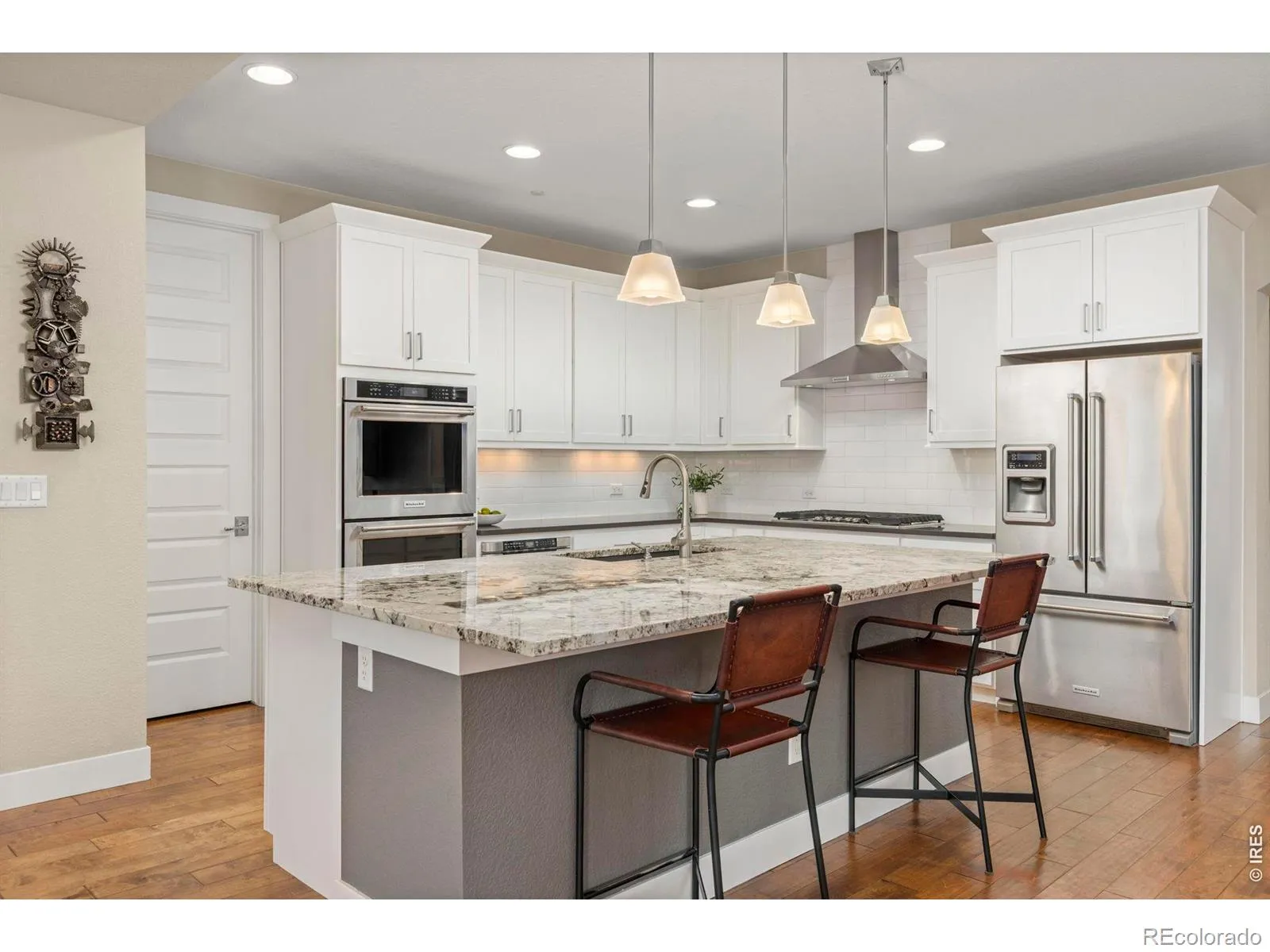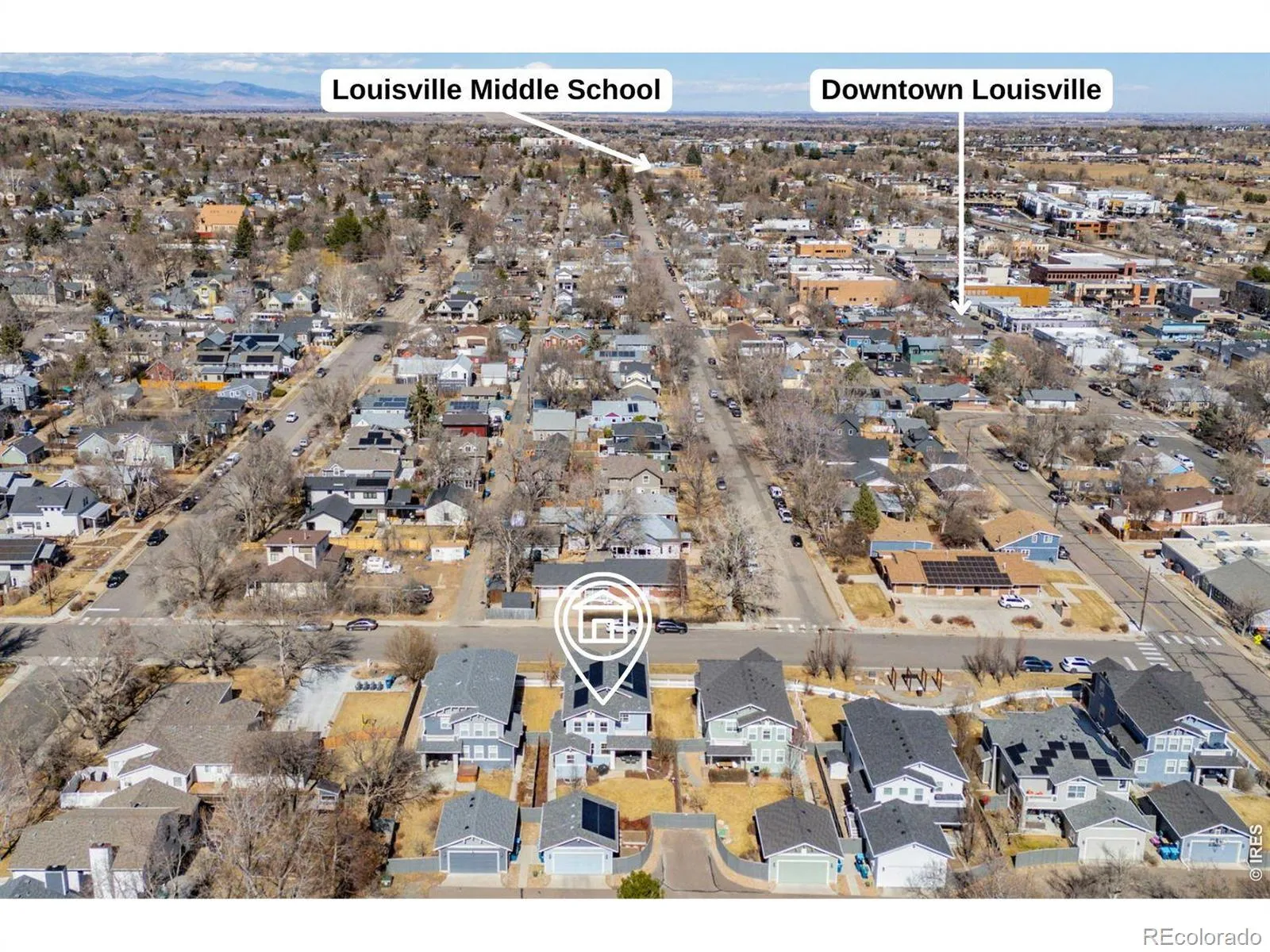 In the heart of Old Town Louisville, ideally situated just a few blocks from vibrant Main Street & Louisville’s Community Park, sits this 5-bedroom, 5-bath, 4271 sqft home featuring a rare 4-bedroom-up layout. A charming, large covered front porch sets the tone as an inviting outdoor living space, welcoming you into a thoughtfully designed open floor plan. The great room flows into the eat-in chef’s kitchen, featuring a casual dining nook and peninsula seating ideal for gathering. A covered patio extends the living space outdoors, overlooking the custom landscaped backyard and creating a seamless setting for entertaining, while the formal dining room offers an elegant space for gatherings. Engineered wood floors span the main and upper levels, providing warmth and architectural continuity throughout. Two dedicated office or flex spaces offer versatility. A well-designed mudroom connects to the detached 2-car garage with convenient alley access. Energy-efficient features include a 15.23 kWp solar system and a 3-zone HVAC system for climate control. Upstairs is defined by vaulted ceilings, enhancing the home’s light-filled and airy ambiance. The primary suite features a 5-piece bath, walk-in closet, and a private balcony. Two additional bedrooms share a hall bath, while the 4th bedroom includes its own ensuite. An upper-level laundry room with a sink adds everyday convenience. The finished basement expands the home with a spacious family room, additional bedroom and bath, and a dedicated gym that could serve as a conforming 6th bedroom. Blending open-concept living with thoughtful design and an unbeatable Old Town location, this home offers space, light, and flexibility just steps from Downtown Louisville.