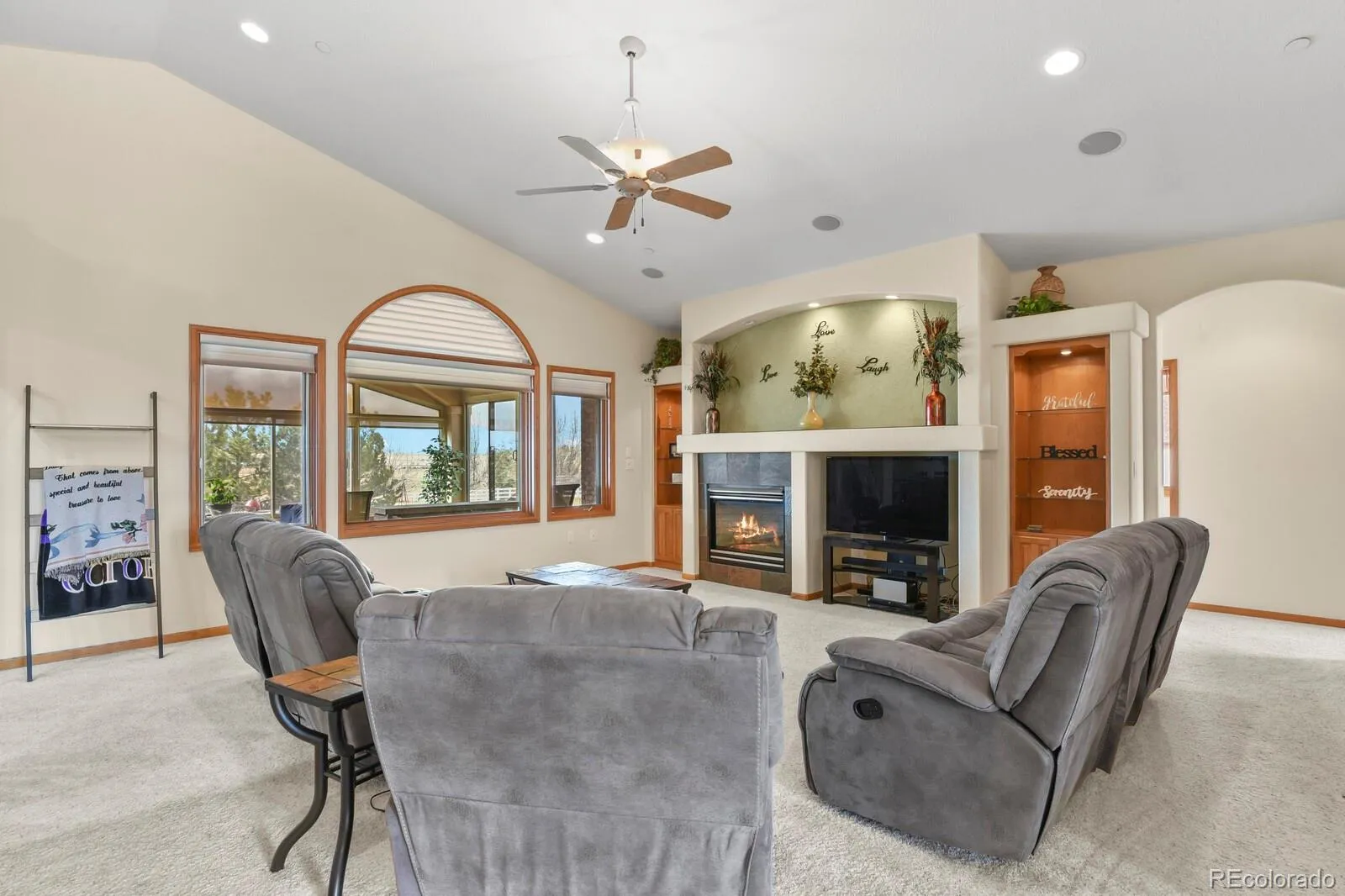 The expansive living room is the heart of the home, featuring a fireplace, elegant architectural details, and oversized picture windows.