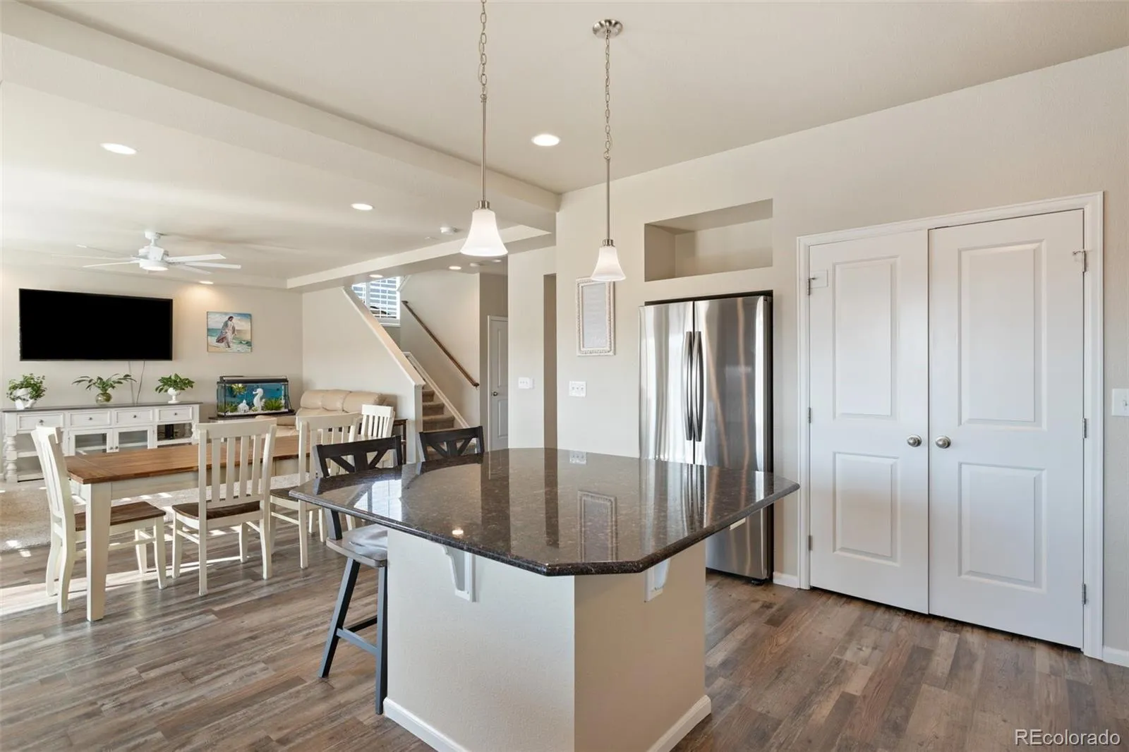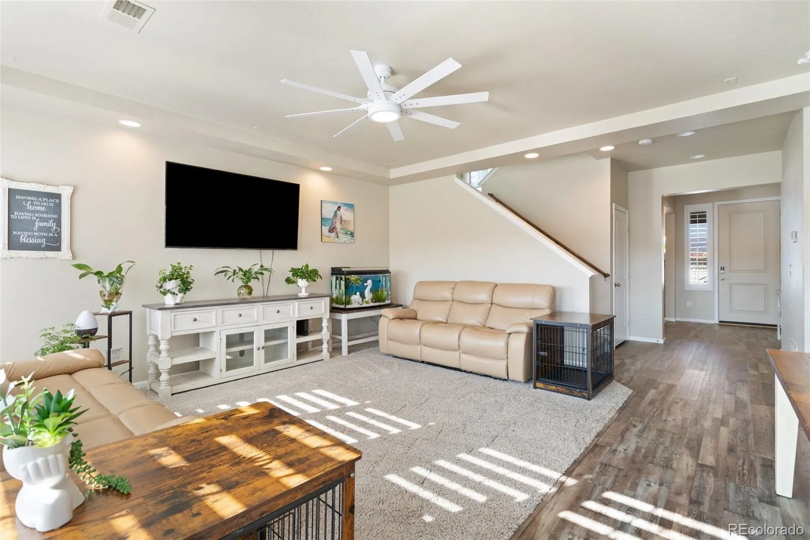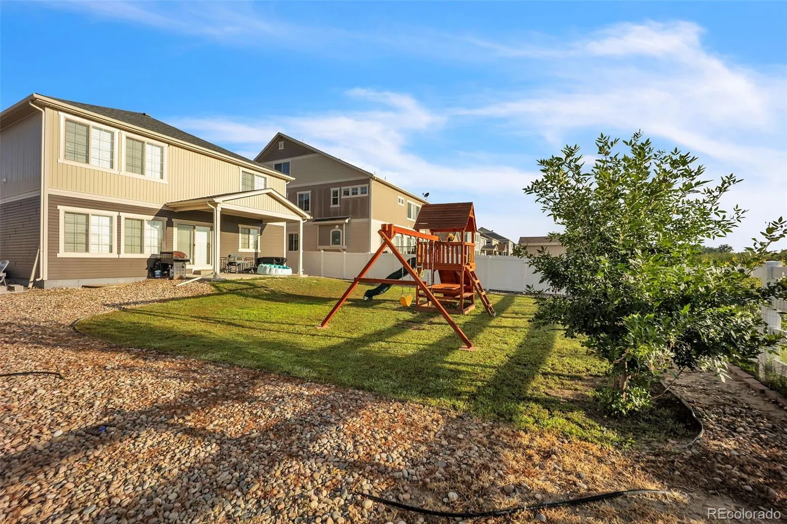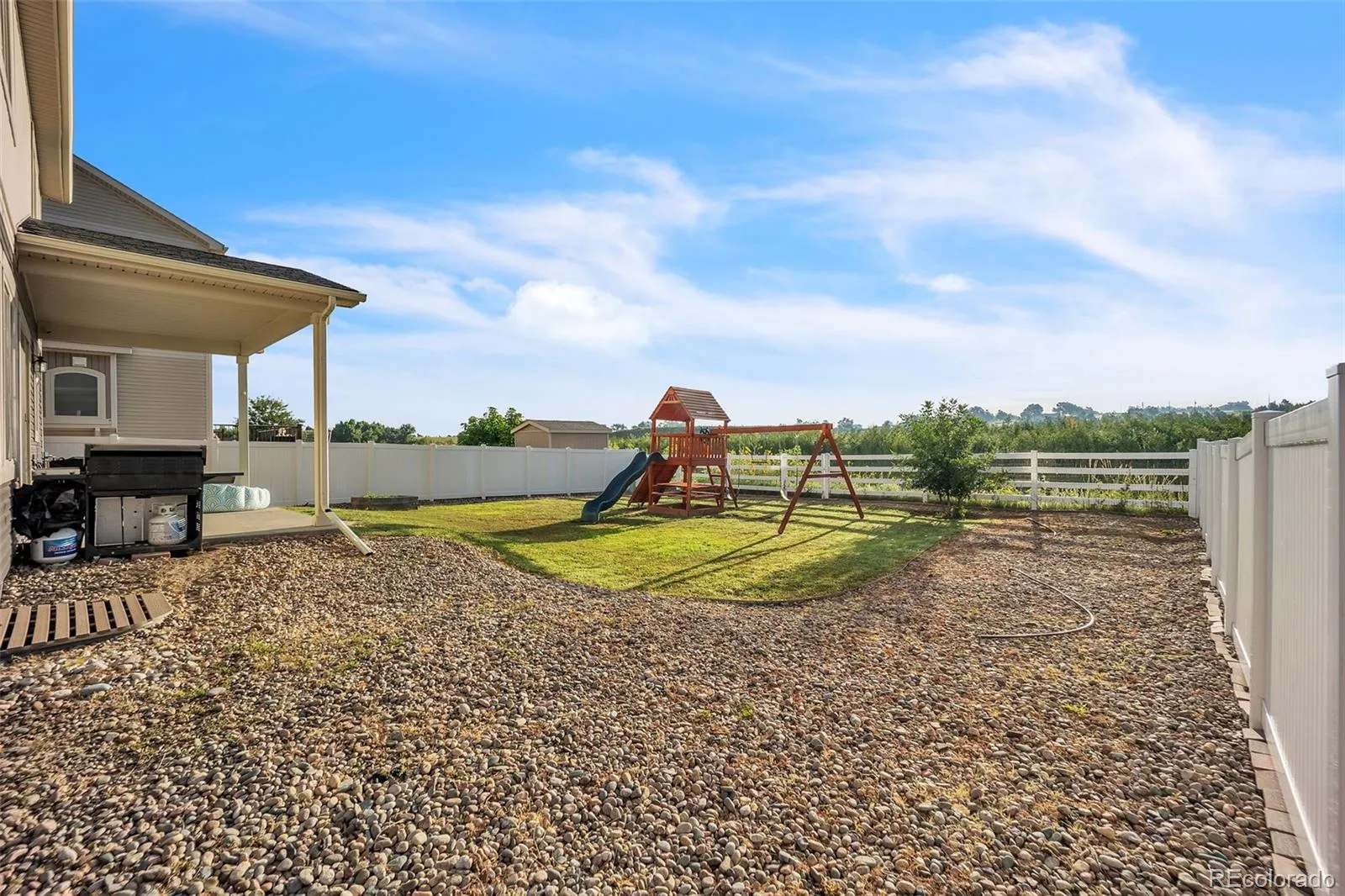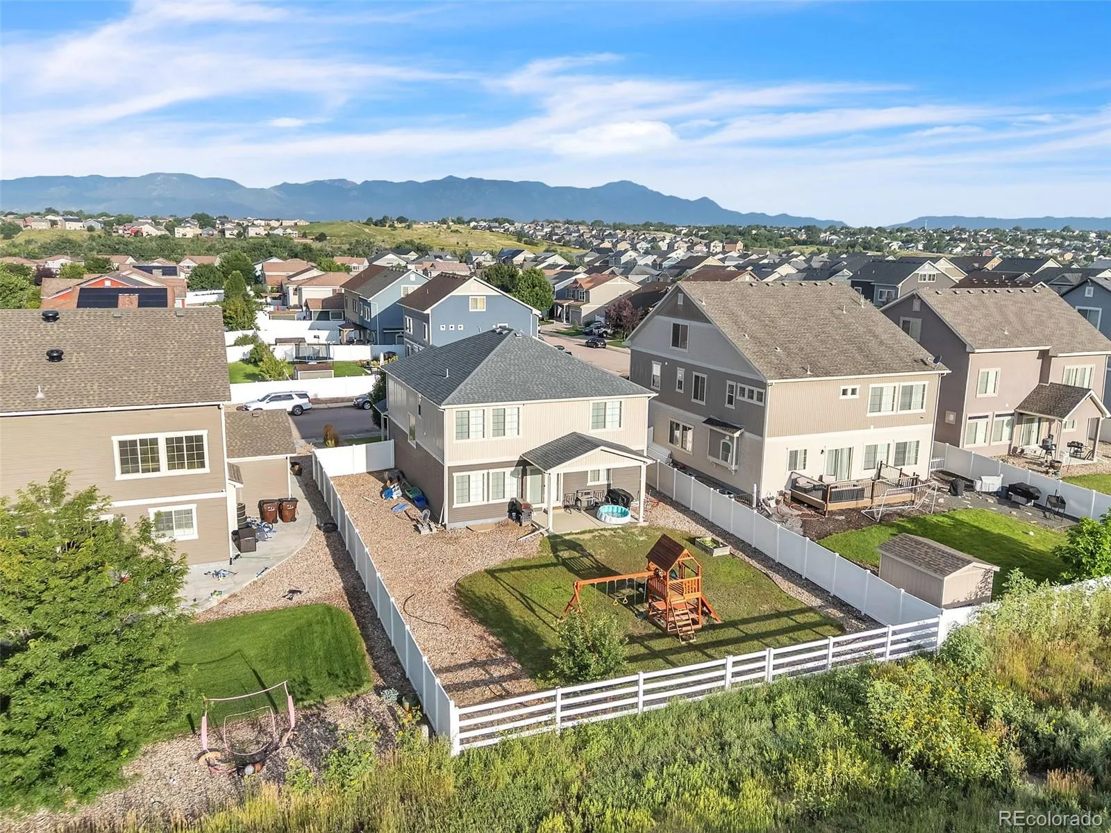 Welcome to this beautifully maintained home in the highly sought-after Cumberland Green community—known for its mountain views, walking trails, parks, and peaceful living. Step into a bright and inviting main level featuring modern updates throughout, luxury vinyl plank flooring, and an open layout designed for both function and style. The gourmet kitchen boasts granite countertops, a large island, newer stainless steel appliances, and a spacious pantry with built-in shelving. It opens to a large dining room and spacious living room, ideal for entertaining or relaxing. A flex room at the front of the home makes a great home office or playroom, while a drop zone off the garage keeps things tidy. You’ll also love the taller garage door height and spacious garage. Upstairs, enjoy all four bedrooms on one level, including a large primary suite with a spa-style walk-in shower, dual vanity, and walk-in closet. A generous loft space is conveniently located near the bedrooms—perfect for a second living area or study nook. The upstairs laundry room adds extra ease to daily routines, and mountain views from the upper level bring a calming backdrop to your day. The unfinished basement offers endless potential—ready to be finished for a guest suite, home gym, or recreation space. Outside, unwind on the covered patio in your fully fenced backyard, offering privacy and great outdoor living. This energy-efficient home features central air to keep you comfortable year-round, plus modern finishes and has been very well maintained—truly move-in ready. Conveniently located near Peterson SFB, Schriever SFB, and Fort Carson, as well as top-rated schools, shopping, parks, and dining—this home has it all