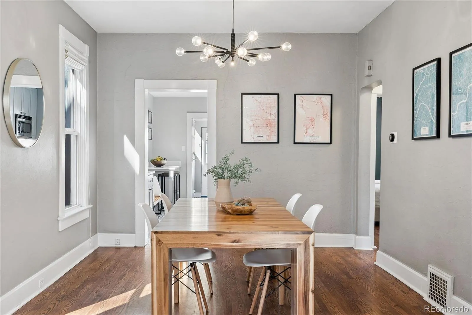 This charming single-family gem in Denver’s highly desirable Sloan’s Lake neighborhood effortlessly blends historic character with casually elegant modern updates, creating a warm, inviting space that’s perfect for relaxed everyday living and effortless entertaining. Step inside to discover an open, light-filled main level where a high-ceiling living room flows seamlessly into a stunning dining area. The spacious dining room easily hosts large gatherings yet is comfortable for casual daily meals. The kitchen offers practical elegance with sleek cabinetry, a large farmhouse sink, stainless appliances, and thoughtful details that keep things functional yet stylish. The stunning primary suite easily fits a king-size bed (a rarity for homes in this area), and boasts an amazing remodeled en-suite bath complete with towel warmers and an oversized walk-in shower. A second bedroom and second bath complete the main floor. Upstairs, a third bedroom and another full bath create the ideal guest suite or home office setup. The basement features a large rec/media room, as well as a fourth (non-conforming) bedroom or gym space, plus ample storage in the large laundry and utility rooms. Outside, the amazing backyard stands out as a true highlight and ideal entertainment space, with a stunning pergola, low maintenance artificial grass and ample play space. A full sized detached two car garage completes this wonderful space. A newer HVAC system ensures easy maintenance and efficiency, creating the ideal blend of historic styling and modern-day ease of living Ideally centered 1 mile from Sloan’s Lake and trails, and 1.5 miles to LoDo for social activities, this home is the ideal balance of style, historic charm and location. Don’t miss out!