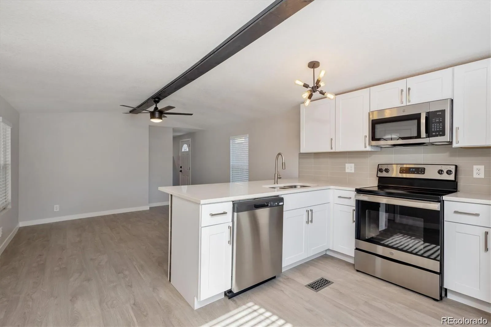 Recent improvements include fresh interior and exterior paint, updated flooring, modern lighting, and refreshed kitchen and bath finishes, creating a bright and inviting living environment. The open-concept kitchen is designed for both daily living and entertaining, featuring white shaker cabinetry, quartz countertops, custom tile backsplash, stainless steel appliances, and generous counter space.