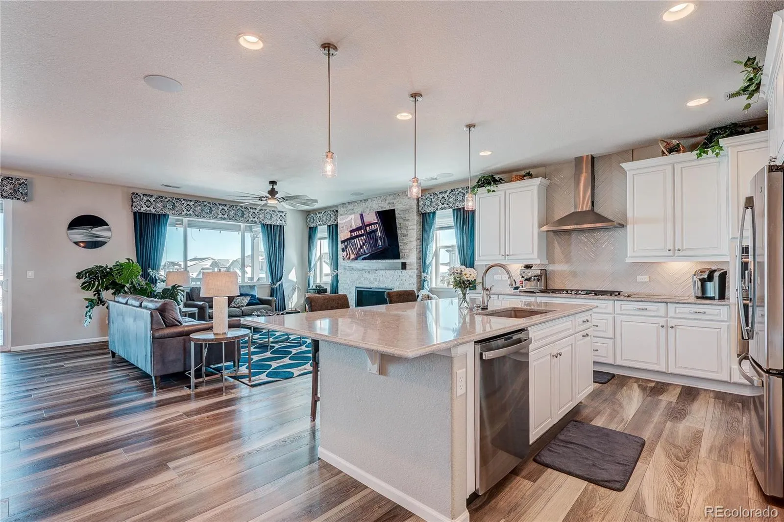 Experience refined living in this beautifully appointed home, where thoughtful design, quality craftsmanship, and elevated finishes come together seamlessly. The chef-inspired kitchen is both stylish and functional, featuring upgraded soft-close cabinetry, under-cabinet lighting, quartz countertops, GE Profile appliances, custom pantry shelving, a striking herringbone subway tile backsplash, an expansive island with counter-height seating, and a custom drawer beneath the gas cooktop. Spa-like baths feature frameless tempered glass shower enclosures, tile shower walls and floors, granite countertops, and a luxurious soaking tub in the primary bath. The private primary suite offers a spacious walk-in closet with custom built-ins, integrated cabinetry, a built-in laundry hamper, and direct access to the laundry area. Throughout the home, upscale details enhance comfort and character, including custom Hunter top-down/bottom-up shades, custom drapery in the great room, an upgraded 12-blade ceiling fan, rounded bullnose wall corners, and owned solar for efficiency and long-term value. Outdoor living is equally impressive with a large deck, 2 custom roll-down shades, an expansive stamped concrete patio, terraced cement planters, and timed sprinkler systems in both the front and back yards. The patio is pre-plumbed for natural gas in 2 locations, plus gas and electric in a third for exceptional entertaining potential. Additional highlights include 8 backyard trees, a custom storm door, iron handrail at the front entry, and custom iron window well covers. A rare garage setup includes an oversized 2-car garage plus an additional approximate 50′ x 16′ RV garage with its own heater, Wethane epoxy-coated floors, extensive 3-gang electrical outlets, and airline outlets throughout. The basement adds versatility with a 3rd bedroom, full bath, rough-in for an additional bedroom and bath, and 2 substantial unfinished storage areas