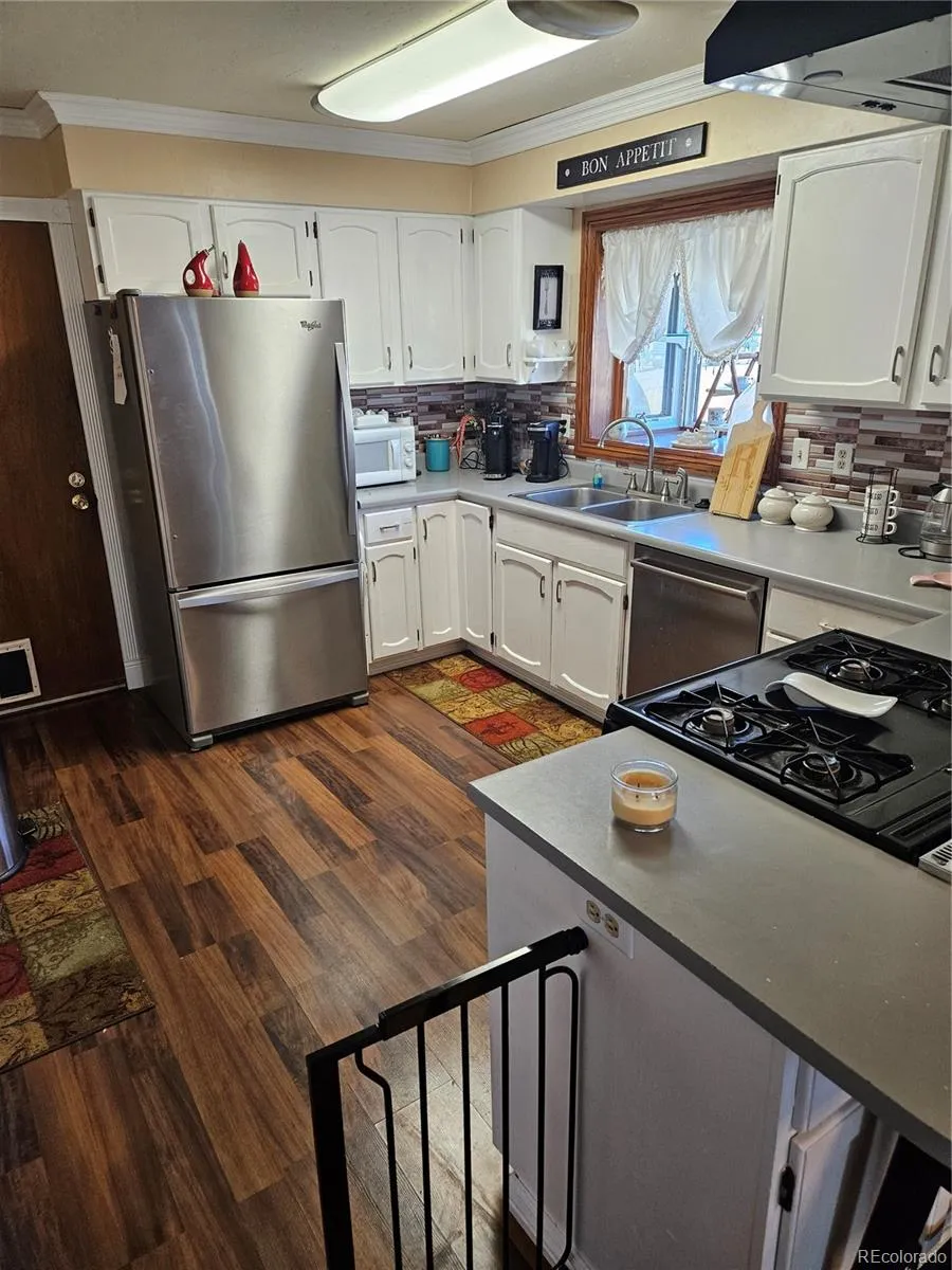 Kitchen features original wood cabinetry, Formica countertops, gas stove, refrigerator,