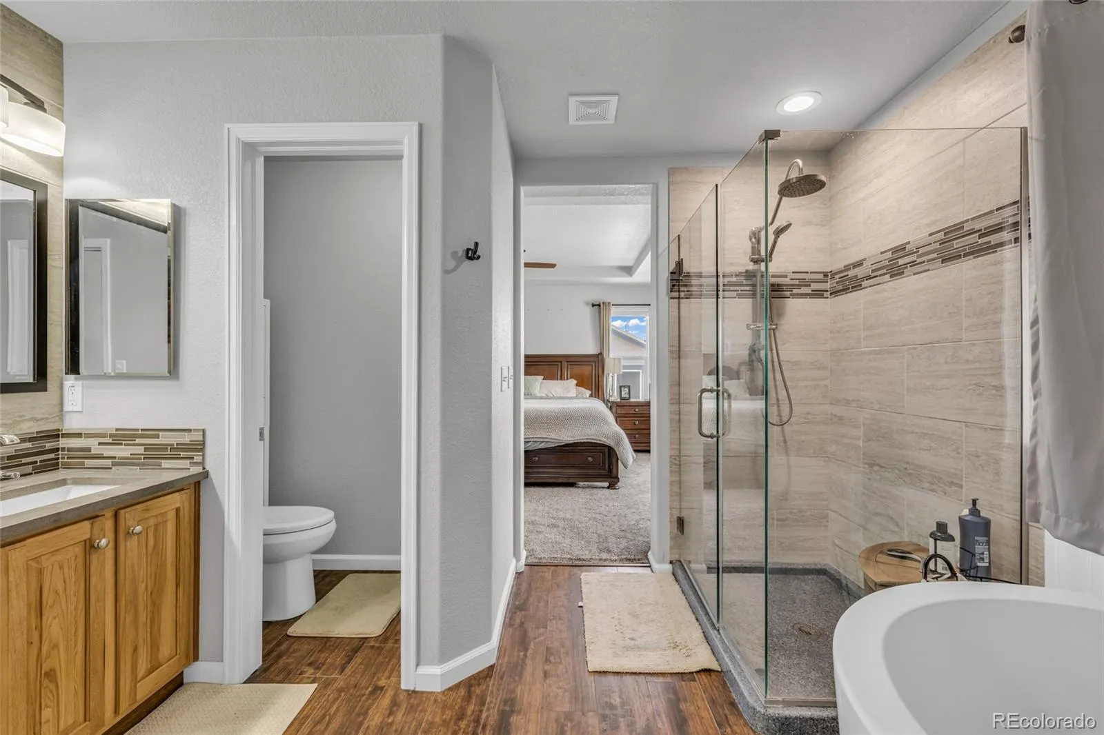 Mountain views from the backyard, primary bedroom, and upper level highlight this well-maintained home located in the Reunion community. The primary suite features large windows and an updated bathroom with Japanese soaking tub, frameless glass shower, quartz countertops, and custom closet system.