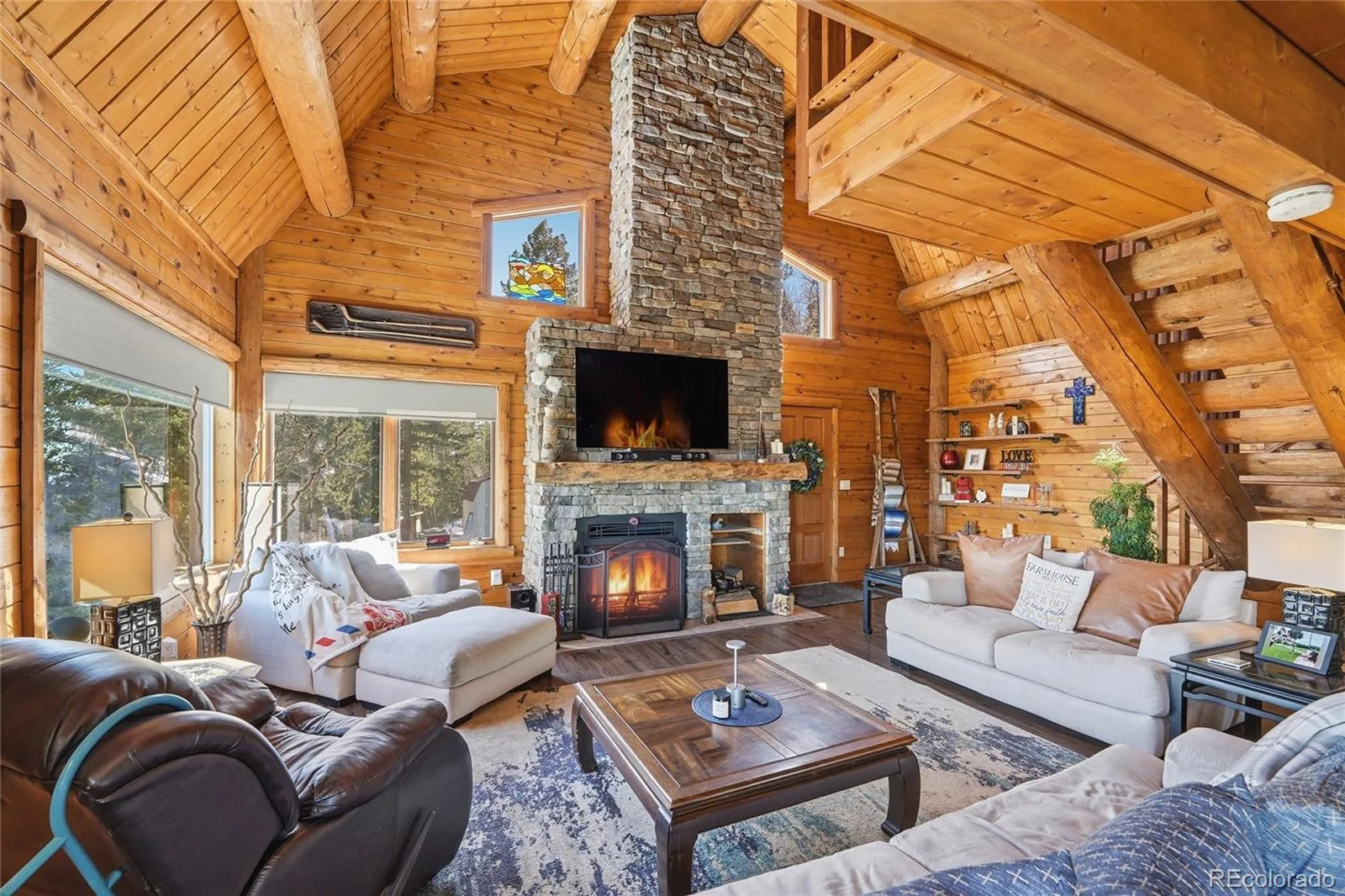 The open main living area offers a warm, welcoming feel, anchored by a dramatic two-story stone fireplace that creates a natural gathering place at the heart of the home. Step outside to expansive decking that’s perfect for morning coffee, evening sunsets, and taking in the quiet mountain setting.