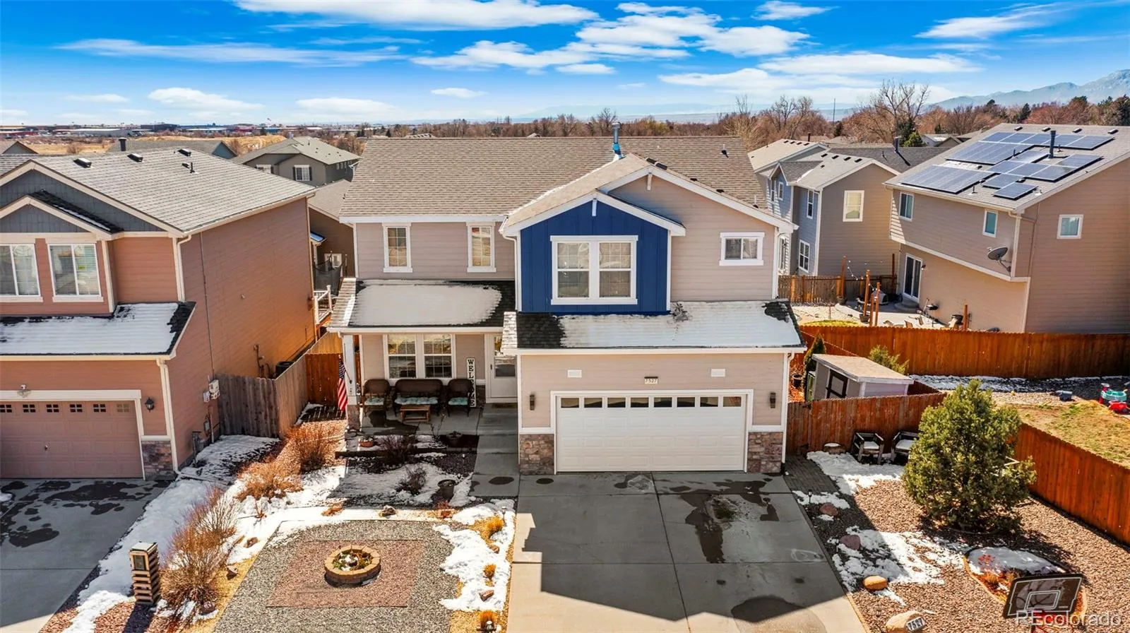 Spacious 2-story home in the Wilshire community offering 5 bedrooms, 3 bathrooms, and over 3,300 finished sq ft of living space. The open main level features a bright living area that flows into the kitchen, with stainless steel appliances, dark cabinetry, a tile backsplash, a gas range, and a center island. The fully finished basement includes a wet bar, an entertaining space, a bathroom with a tiled shower, and a built-in sauna. Basement furniture is included, making it move-in ready for hosting or relaxing. Enjoy the fully fenced backyard with artificial turf, landscaping, and a covered pergola patio perfect for outdoor dining and gatherings. Additional features include a covered front porch and an attached 2-car garage. Convenient location just 2.2 miles from Peterson Space Force Base, 12.2 miles to Schriever Space Force Base, 15 miles to Fort Carson, and 21 miles to the U.S. Air Force Academy, making it ideal for those needing quick access to local military installations.