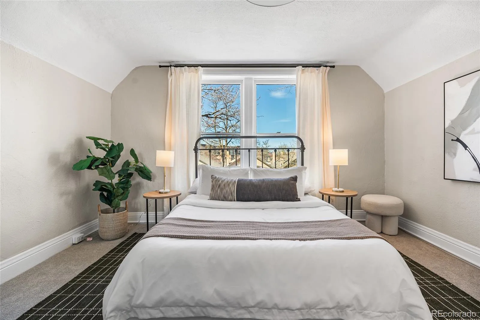 The charming original brick wall leads you upstairs to two oversized bedrooms. The primary bedroom has soaring vaulted and beamed ceilings with a newly added spa like 5-piece ensuite bath. The guest bedroom boasts mountain views and a beautifully renovated full guest bath. The basement provides excellent flexibility with space for laundry, a home gym, or abundant storage.