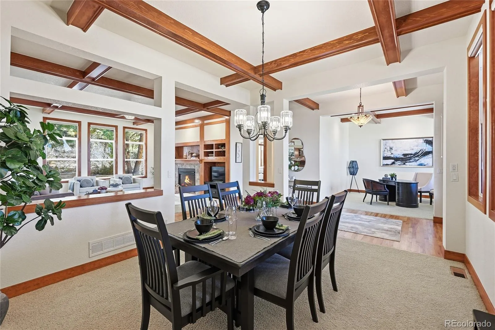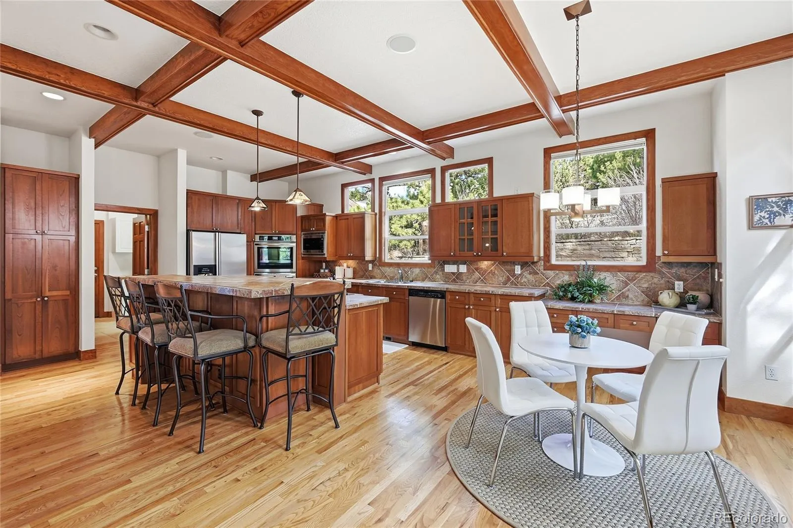 Step inside to soaring ceilings accented by stunning wood beams and rich solid wood doors that add warmth and character throughout the main level. The open floor plan invites effortless living and entertaining, centered around a beautiful eat-in kitchen with striking cherry wood cabinetry and a fantastic sit-around kitchen island.